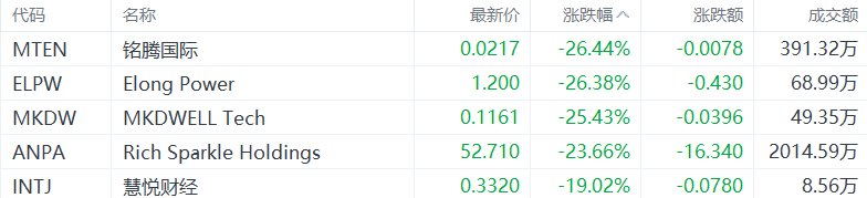 格隆汇1月23日|中概股收盘跌幅居前的个股为:铭腾国际跌26.44%,ElongPower跌26.38%,MKDWELLTech跌25.43%,RichSparkleHoldings跌23.66%,慧悦财经跌19.02%。(格隆汇)