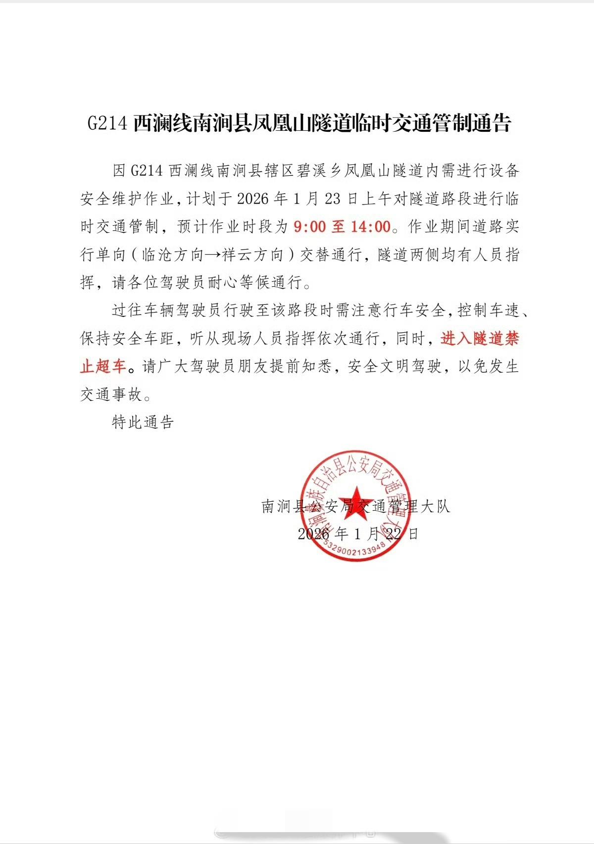 G214西澜线南涧县凤凰山隧道临时交通管制通告: 因G214西澜线南涧县辖区碧溪乡凤凰山隧道内需进行设备安全维护作业,计划于2026年1月23日上午对隧道路段进行临时交通管制,预计作业时段为9:00至14:00。作业期间道路实行单向(临沧方向→祥云方向)交替通行,隧道两侧均有人员指挥,请各位驾驶员耐心等候通行。过往车辆驾驶员行驶至该路段时需注意行车安全,控制车速、保持安全车距,听从现场人员指挥依次通行,同时,进入隧道禁止超车。请广大驾驶员朋友提前知悉,安全文明驾驶,以免发生交通事故。 特此通告 南涧县公安局交通管理大队 2026年1月22日大理高速路况