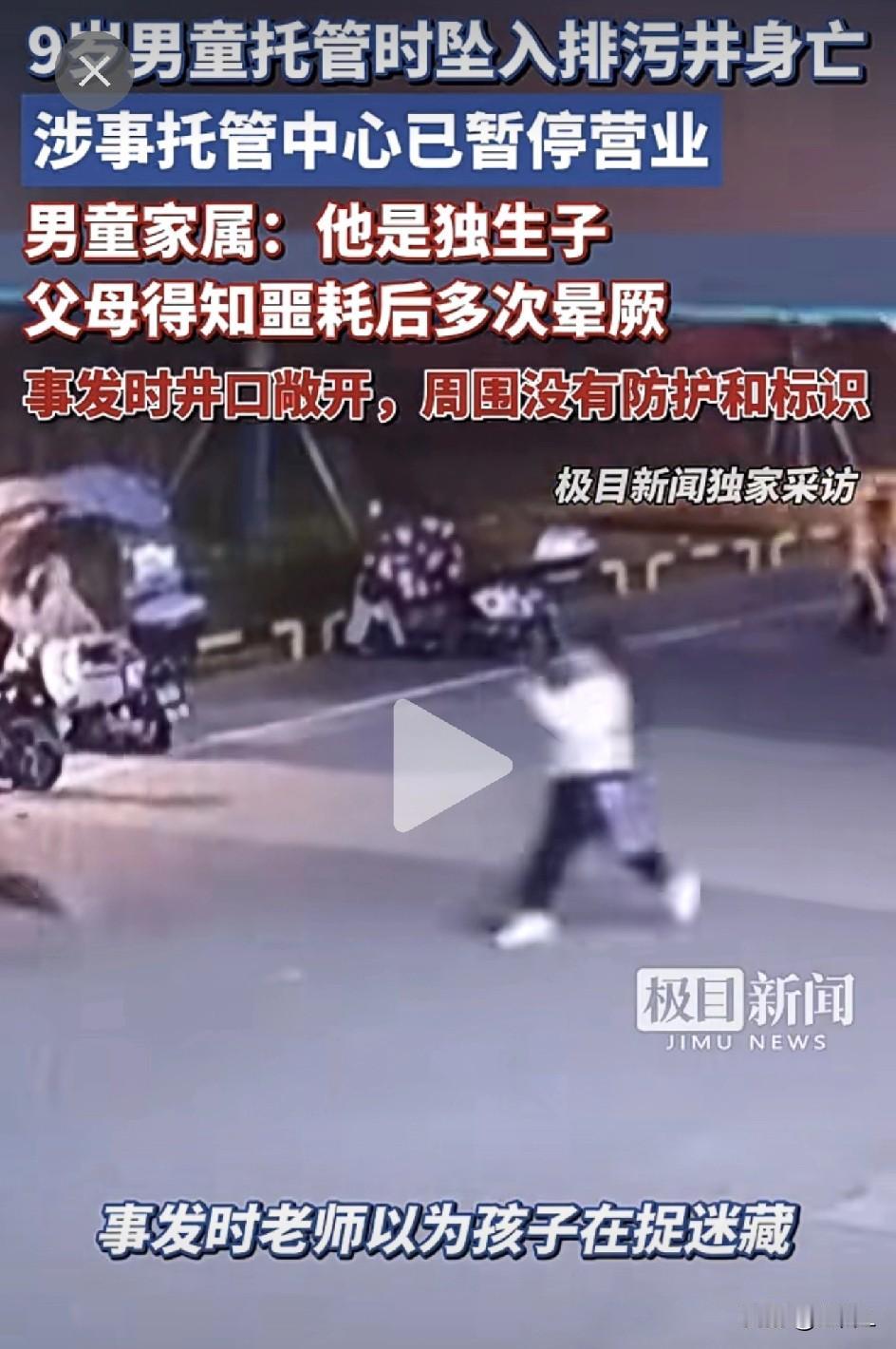 9岁男孩掉进3米深井身亡!井口大开无人管,妈妈哭晕数次:我就这一个孩子啊! 心痛!课间玩耍竟成永别! 1月19日晚上6点多,福建宁德一个9岁小男孩,在托管班下课休息时,出门玩了一会儿就失踪了。 4分钟后,老师慌了神,赶紧联系家长并报警。 警察赶到现场,从一口排污井里把孩子捞了上来,可是已经来不及了——井深足足有3米,孩子就这么没了。 更气人的是后续! 孩子家属第二天早上7点去看,发现那个“吃人”的井口还是大开着,什么防护都没有!直到当天下午,相关单位才慢吞吞地开始补救。 托管班老师说:“我们以为孩子在玩捉迷藏…”后来有学生提醒“那里有个洞”,老师去看才发现井盖不见了,这时候才报警。 小区物业说:“井盖平时是有的,但不牢固…”他们连夜检查了小区所有井盖,但这个出事的井盖是开发商装的,物业只负责在上面覆盖。 这个9岁男孩是家里的独苗,父母听到消息后当场晕过去好几次。家人现在只想要个明白:到底谁该负责?孩子最后时刻到底经历了什么? 目前托管班已经停业,井口周围放了警示标志。警方正在调查,责任认定和赔偿问题还在处理中。 网友炸锅: “安全不是儿戏!” “3米深的井居然不加防护?” “老师4分钟后才发现不对劲?” “出了事第二天还不赶紧处理?” 一条鲜活的生命就这样消失在敞开的井口里。我们不禁要问:这样的安全隐患还有多少?孩子的安全底线到底在哪里? 希望这样的悲剧能真正敲响警钟——别再让“井盖吃人”的悲剧重演! 素材来源:极目新闻,侵联删!