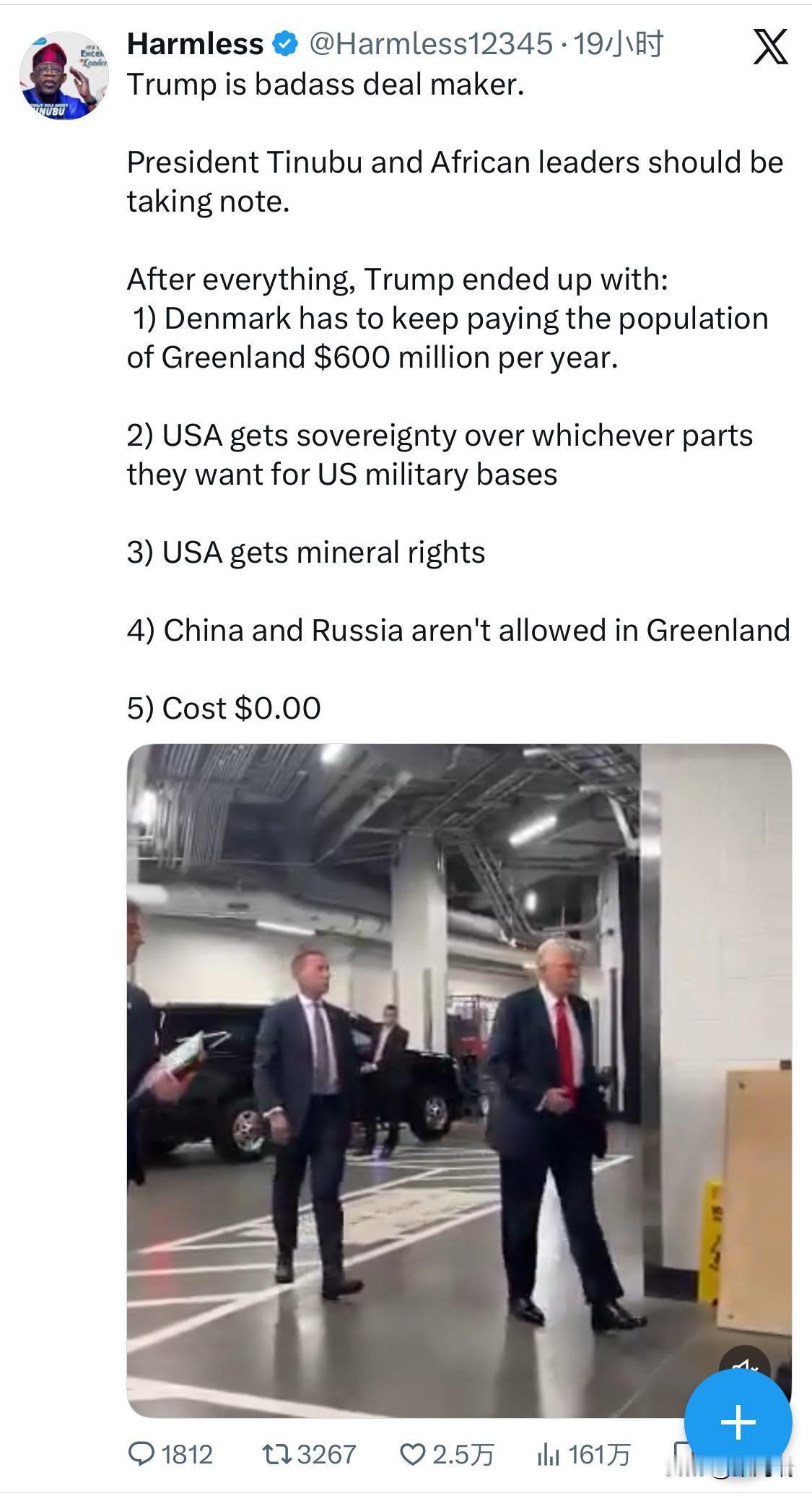 特朗普是个谈判高手。 尼日利亚总统蒂努布和其他非洲领导人应该注意这一点。 最终,特朗普得到了: 1) 丹麦必须每年向格陵兰岛居民支付 6 亿美元。 2)美国可以对其希望用于建立美国军事基地的任何地区拥有主权。 3)美国获得矿产开采权。 4)中国和俄罗斯不允许进入格陵兰岛。 5) 成本 0.00 美元。