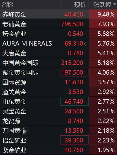 港股贵金属板块亦大涨,个股近全线飘红。截至发稿,赤峰黄金涨超9%,老铺黄金涨近8%,大唐黄金、中国黄金国际涨超5%。