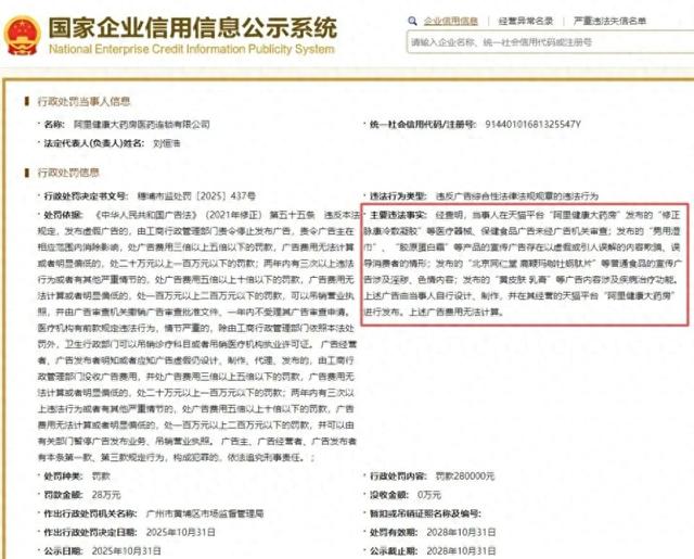 而据国家企业信用信息公示系统,就在2025年10月31日,阿里健康大药房医药连锁有限公司因设计、制作并发布未经审查的医疗器械、保健食品广告,及发布虚假误导广告,发布普通食品的宣传广告涉及淫秽、色情内容等,被罚款28万元。