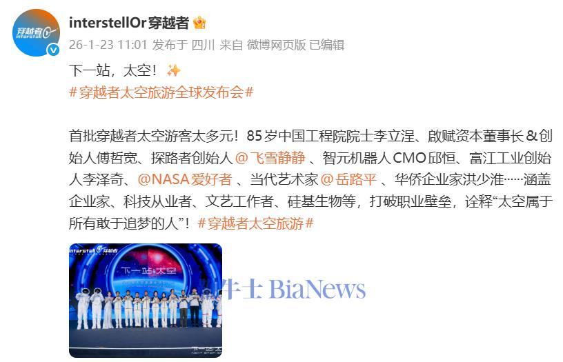 截至目前,穿越者已预订超三艘船,签约来自学界、商界、航天界、艺术界、娱乐界等领域太空游客,其中还包括众擎机器人。