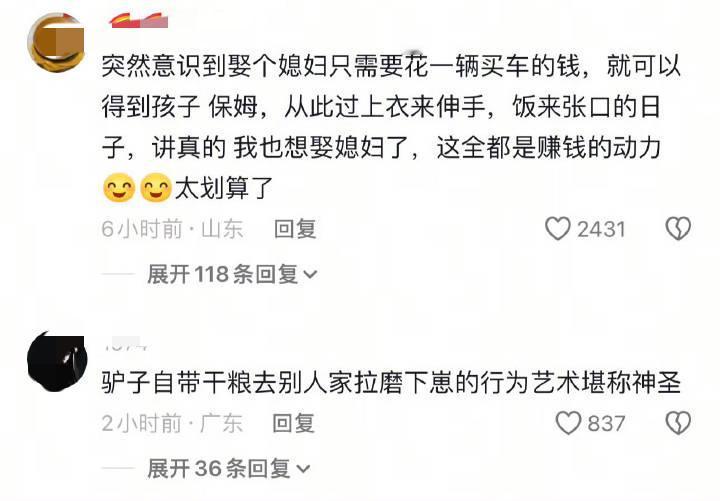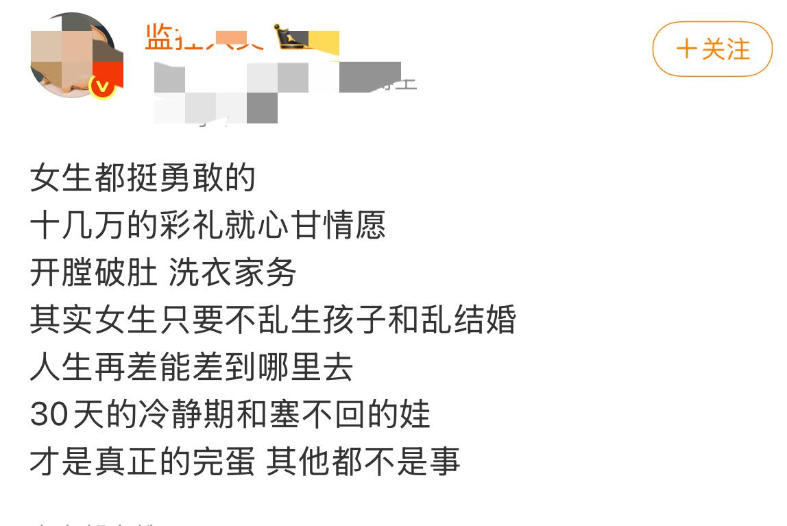 有点明白现在的女孩子为什么不愿意结婚了,这世界最双标的事就是婚姻了!双标行为 入赘是百万彩礼的,嫁人是嫁妆彩礼要带回的[允悲]!下嫁也是百万陪嫁,彩礼却是十几万,问题是这十几万的彩礼有些不完全属于女方,要么给男的搭进去买婚房了,要么买家具了[允悲],要么干脆最后不给的。要知道在古代陪嫁都是官方登记在册的女方私产啊!好多婚后都在惦记彩礼这个钱,甚至有的婆家 娘家都惦记,女孩子真的很难,好一点的大部分花孩子身上,小部分花自己身上,不好的自己一分没花还落埋怨!而且许多男人还喊着0彩礼!双标婚姻婚恋双标 压榨女性真的会让这些男人们有成就感吗?我想并不单单是吧!主要是他们能从中获利啊!