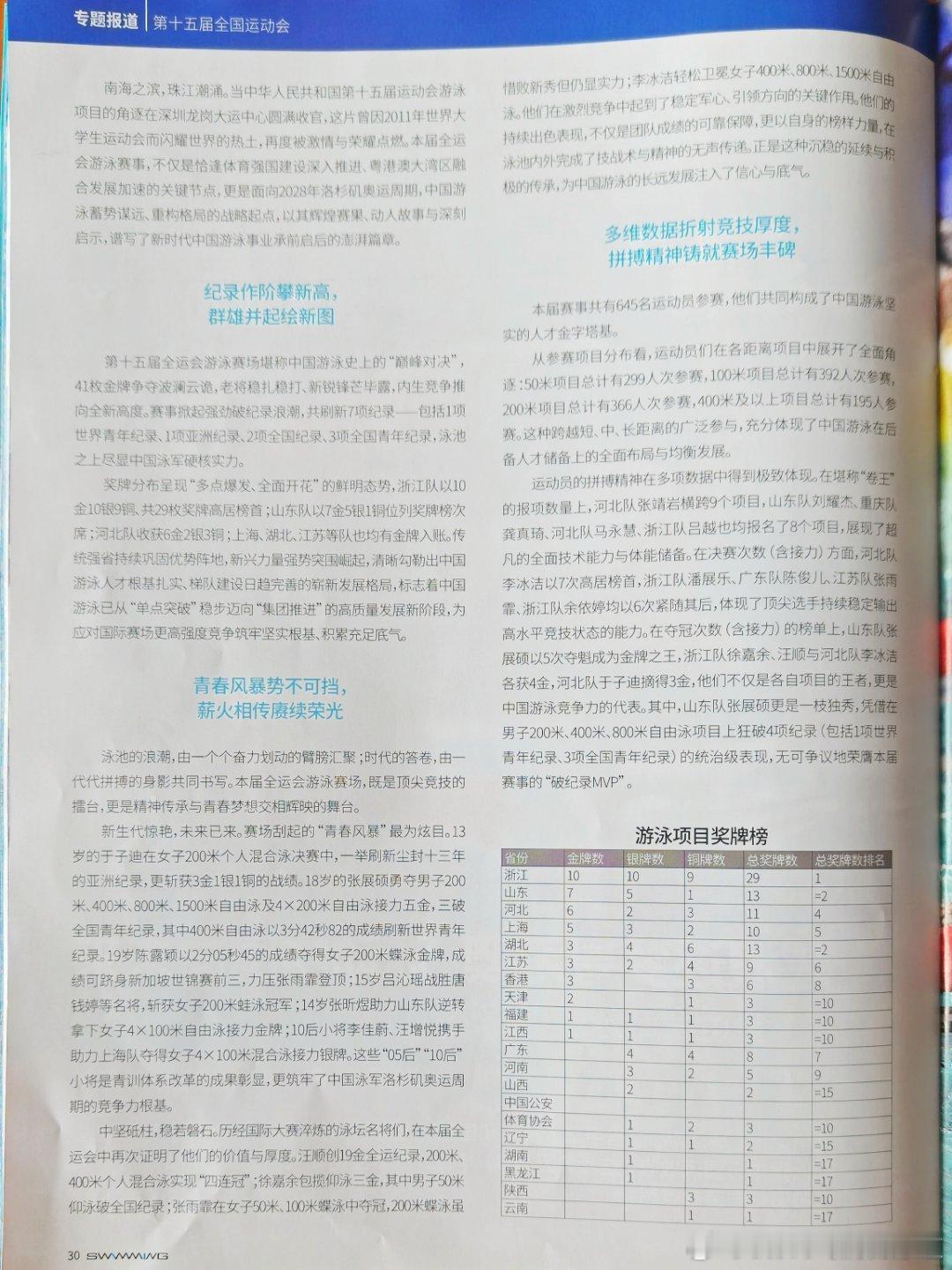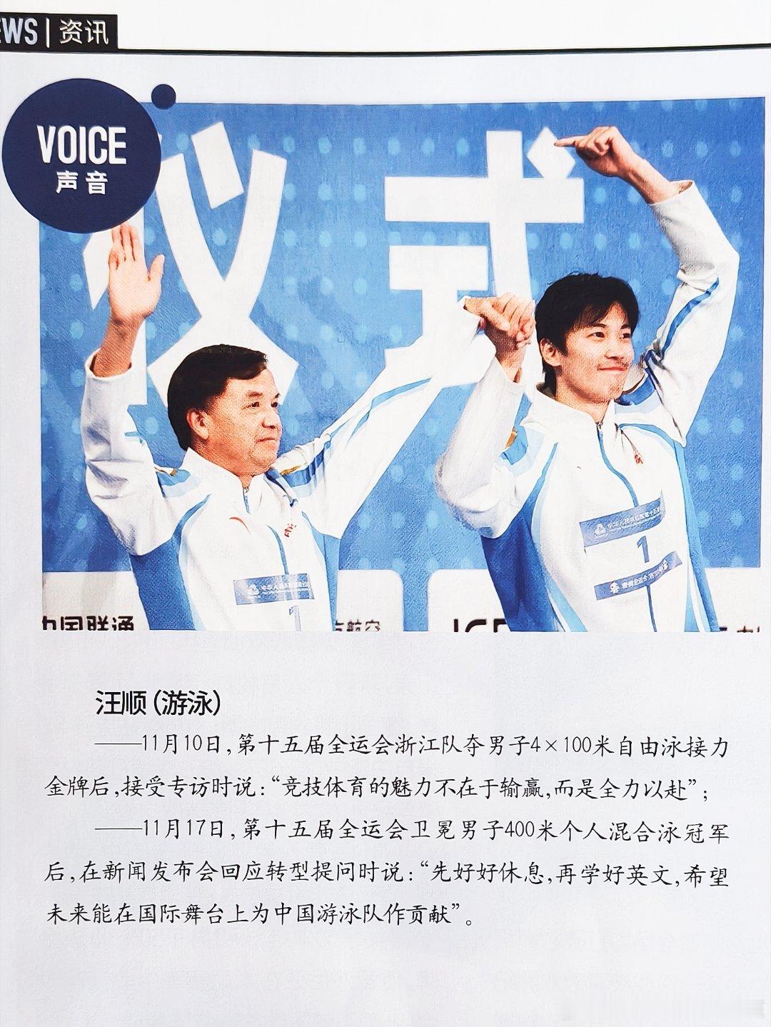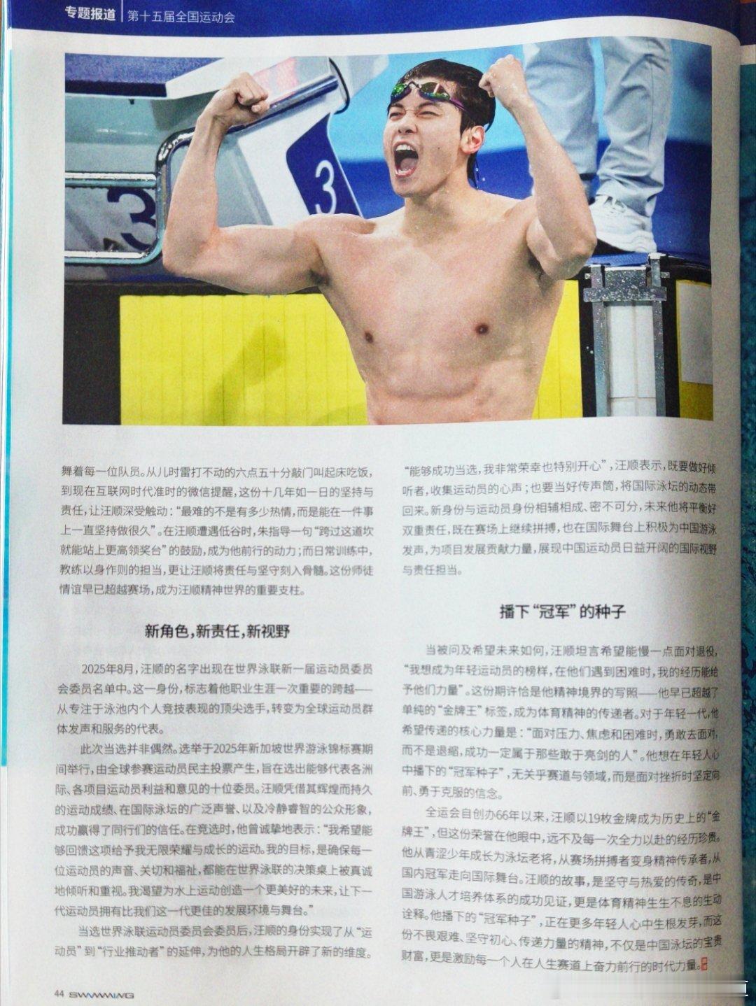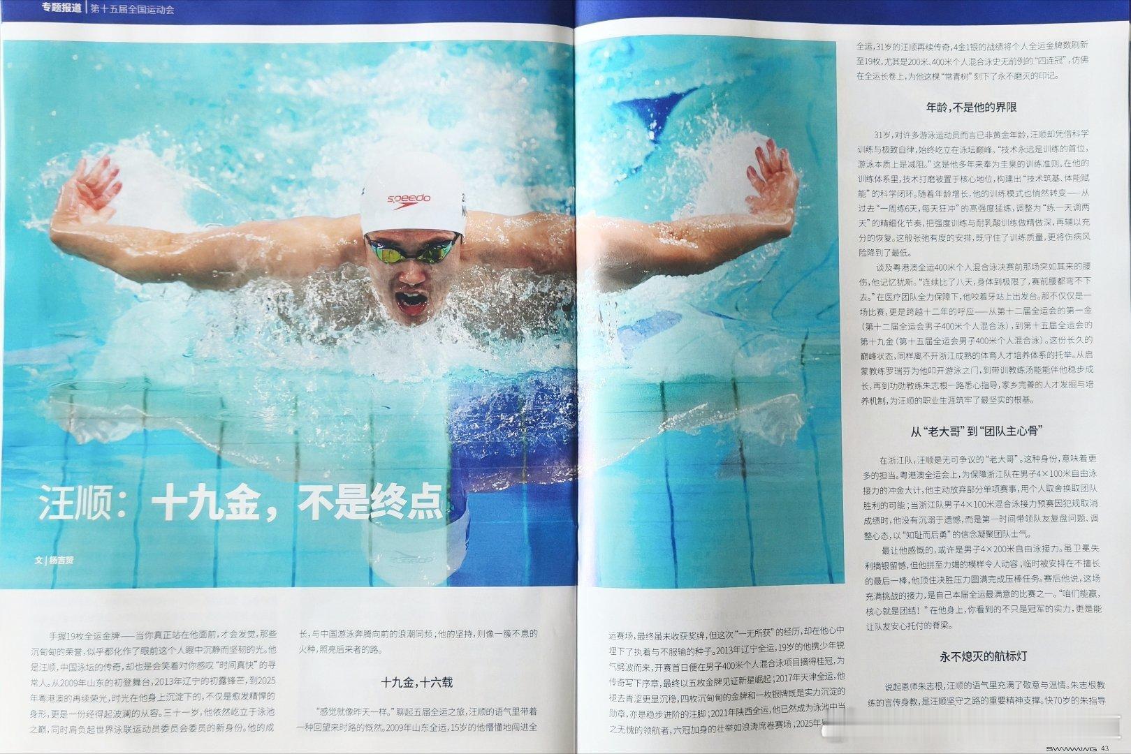 《游泳杂志》2025年第6期|第十五届全运会专题报道|【汪顺:十九金不是终点 】|手握19枚全运金牌——当你真正站在他面前,才会发觉,那些沉甸甸的荣誉,似乎都化作了眼前这个人眼中沉静而坚韧的光。他是汪顺,中国泳坛的传奇,却也是会笑着对你感叹“时间真快”的寻常人。从2009年山东的初登舞台,2013年辽宁的初露锋芒,到2025年粤港澳的再续荣光,时光在他身上沉淀下的,不仅是愈发精悍的身形,更是一份经得起波澜的从容。三十一岁,他依然屹立于泳池之巅,同时肩负起世界泳联运动员委员会委员的新身份。他的成长,与中国游泳奔腾向前的浪潮同频;他的坚持,则像一簇不息的火种,照亮后来者的路。汪顺的2026汪顺的第五届全运会9图速览2025世界眼中的中国顺流而上游泳