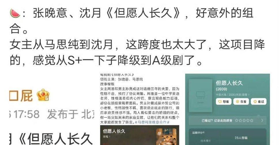 《但愿人长久》组训🈶 主演:张晚意、沈月制作公司:歆光影业导演:王为(似锦)编剧:周涌(点燃我温暖你)3月开机,阵容应该不会再调整了~这部剧不该遛马思纯的!不管是女主角色适配度、cp化学反应、主演综合咖位都是上上之选,凭空拔高了粉丝和观众的期待,所以才会对现在的组合这么抵触。。。
