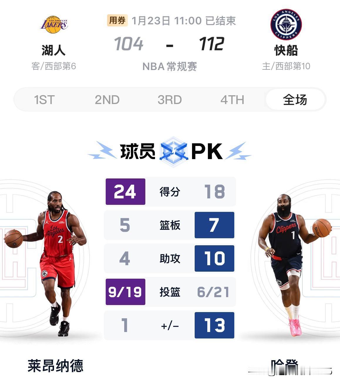 湖人翻盘未果1 04: 11 2不敌快船,排名下滑至西部第六。 今日湖人挑战同城劲敌快船队,伤缺三场的伦纳德火线复出,上半场快船便取得17分的领先优势。第三节湖人追回3分仍落后1 4分进入末节争夺,最后一节前半段詹姆斯带领一众替补进行反扑,差距迅速迫近到个位数,比赛还剩6分钟时分差只有2分(91:93),随后湖人连续犯错,快船打出一波7:0高潮,湖人再无力回天。翻盘未果104:112遗憾输球,排名下滑至西部第六,快船坐稳西部第十。 东契奇詹姆斯伦纳德哈登见下图
