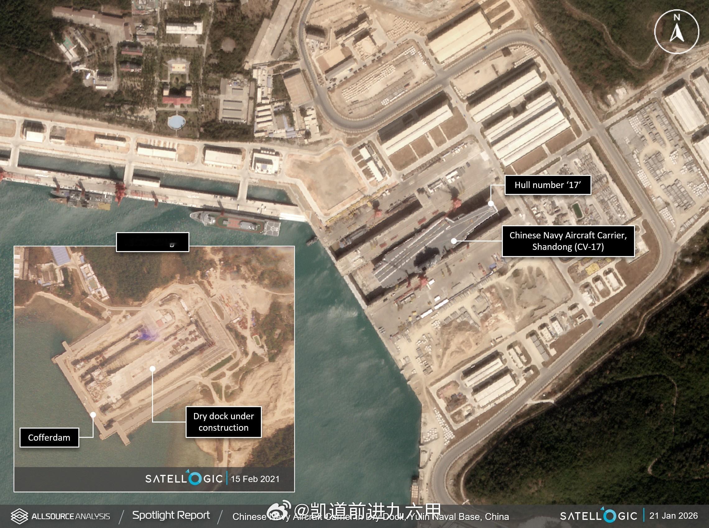 外国卫星拍摄的17号山东舰入坞维护/升级的高清图,日期为1月21日 参照辽宁舰,预计升级时间7个月左右,进行J35上舰的适应性改造 PS:这个大船坞下方疑似在建另一个巨型船坞,建成后可同时维护之后更多、更大的航母 图源见水印烽火问鼎计划福建舰