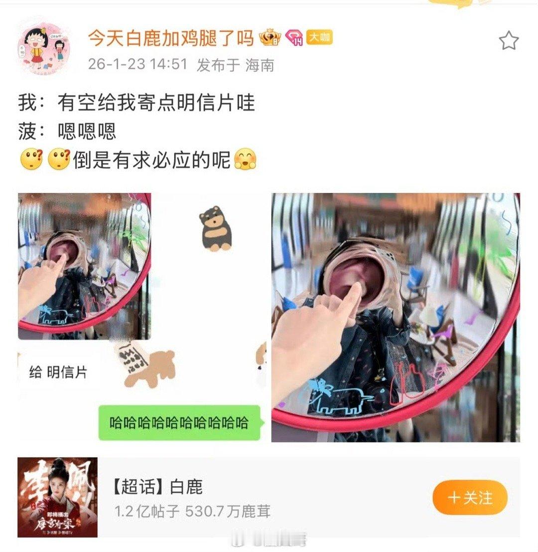 白鹿对呵呵主打一个有求必应哇塞了啊,此时此刻谁不想魂穿呵呵,闺蜜是大明星白鹿,没想到白鹿对呵呵主打一个有求必应,呵呵问白鹿要明信片,白鹿就给呵呵秒发照片,看来白鹿录制《亲爱的客栈》很开心啊!白鹿亲爱的客栈给呵呵的明信片