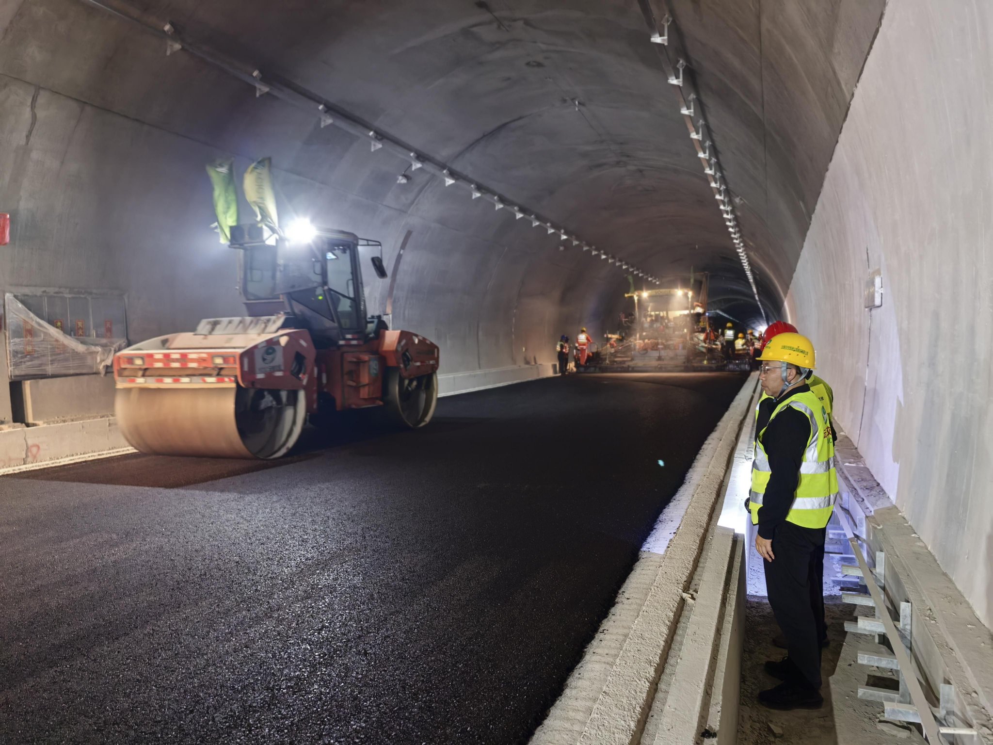 绿色施工赋能,作业环境焕新。与传统热拌沥青相比,该低温改性沥青混合料拌和、摊铺温度大幅降低,出料温度135—140℃,摊铺温度115—120℃,施工中几乎无烟尘,有害气体排放量显著减少,从根本上改善了隧道作业环境。现场施工人员反馈,作业环境清爽,无需佩戴防护设备,工作效率明显提升。