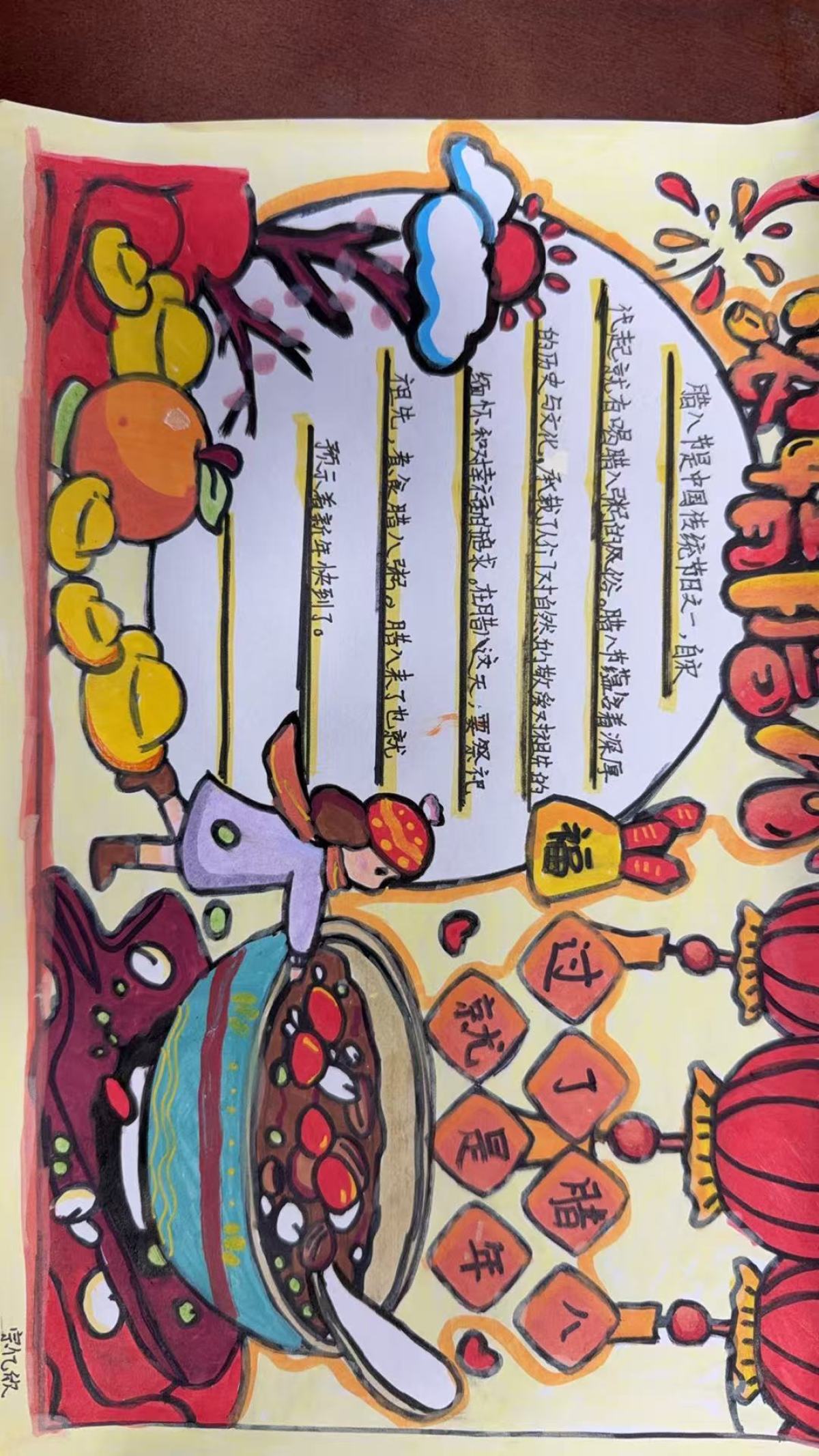 此外,学校还开展了腊八主题创意活动。低年级学生用彩笔绘制“我心中的腊八粥”手抄报,色彩鲜艳的画作里满是童真童趣;高年级学生则围绕“腊八节与年俗文化”开展古诗文阅读,抒发对传统文化的喜爱之情。