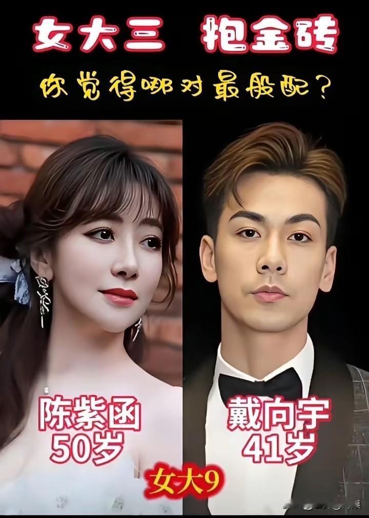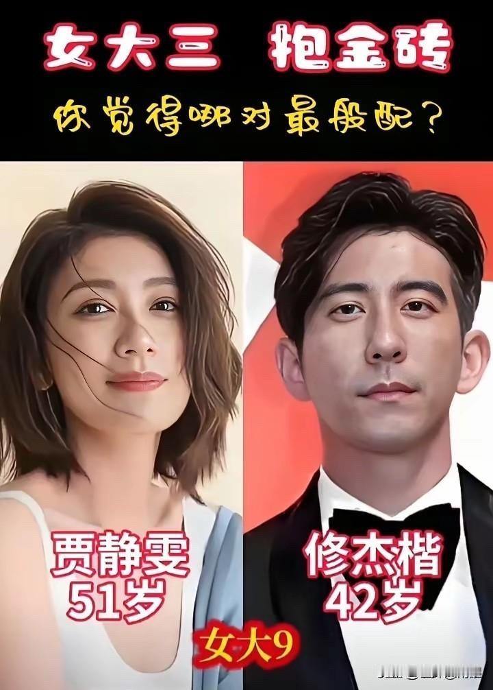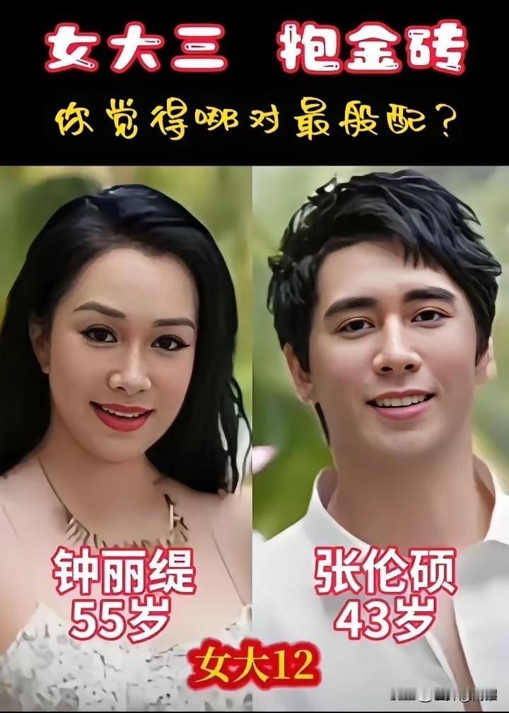 都是“女大三,抱金砖”的搭配,让瞅瞅哪对最般配。 萧敬腾(39岁)和林有慧(52岁),女大13。萧敬腾,咱都知道,“雨神”嘛!唱歌出身,《王妃》、《新不了情》那是响当当。林有慧是他经纪人,算是幕后英雄。 钟丽缇(55岁)和张伦硕(43岁),女大12。钟丽缇,那可是当年多少人的“女神”啊!《人鱼传说》里那条美人鱼,迷倒一片;《中南海保镖》里和李连杰搭档,也是风情万种。张伦硕,演员、模特,参演过《姐姐立正向前走》等电视剧,更多人知道他是通过综艺节目。 贾静雯(51岁)和修杰楷(42岁),女大9。贾静雯,演技派女神!《倚天屠龙记》里的赵敏,精灵古怪;《至尊红颜》里的武媚娘,又美又狠;还有《我们与恶的距离》,演得深入人心,拿了金钟奖。修杰楷也是演员,演过《痞子英雄》、《战神》等剧。