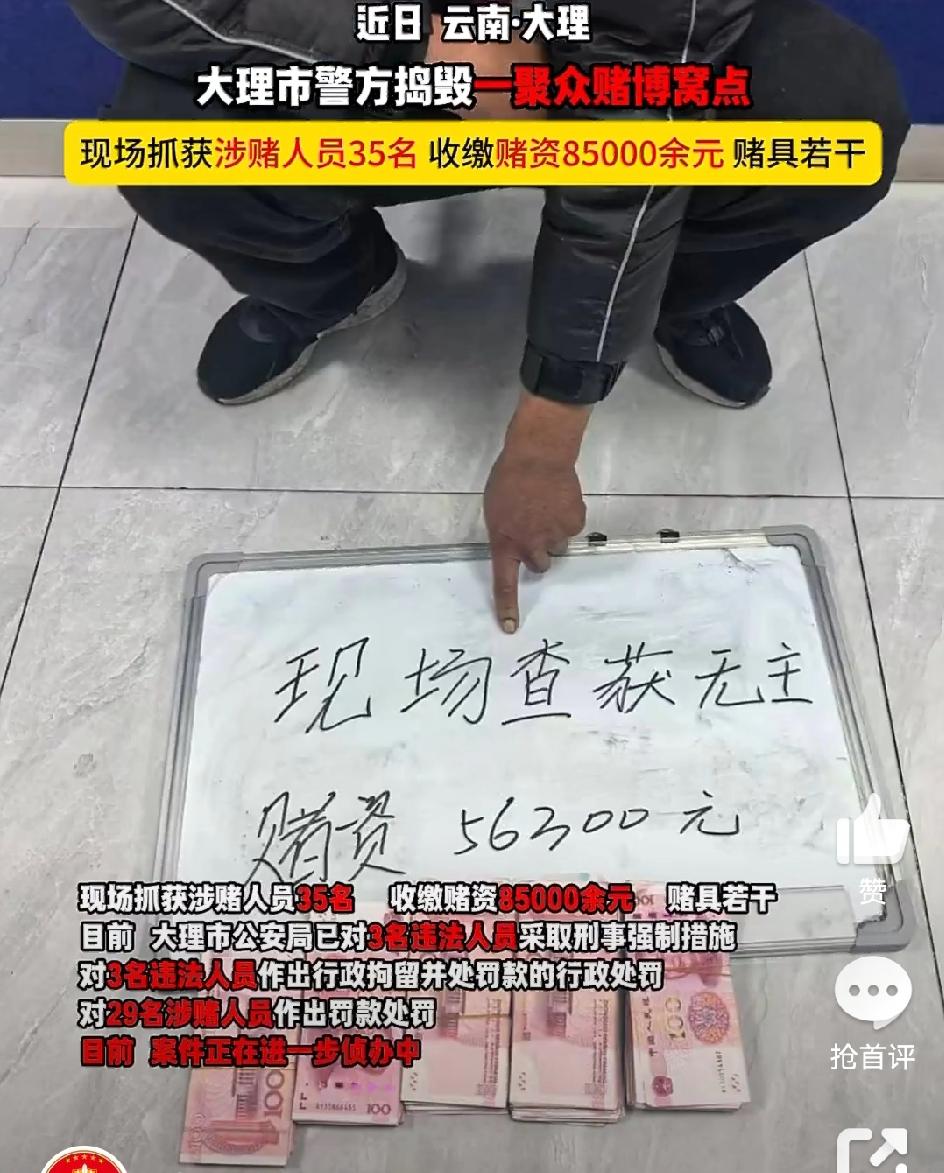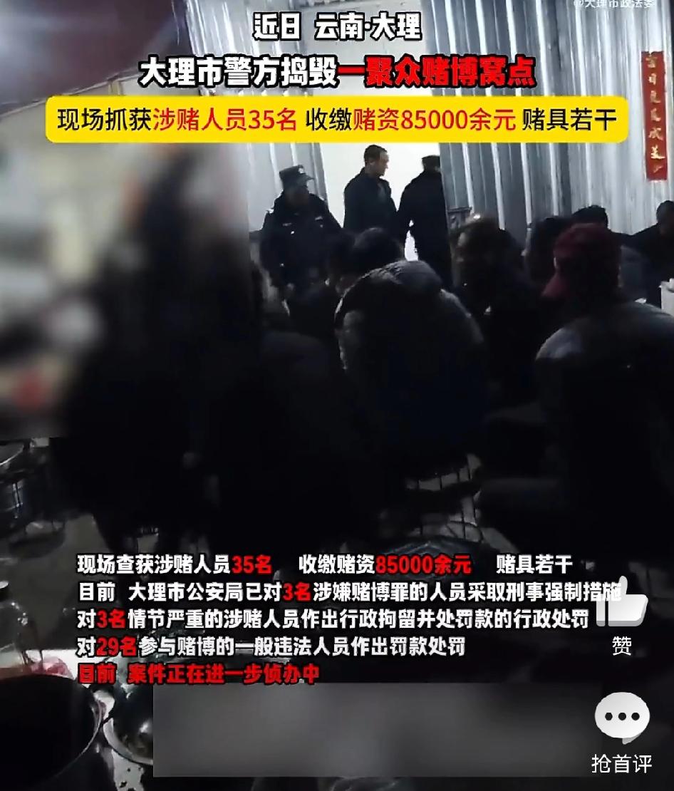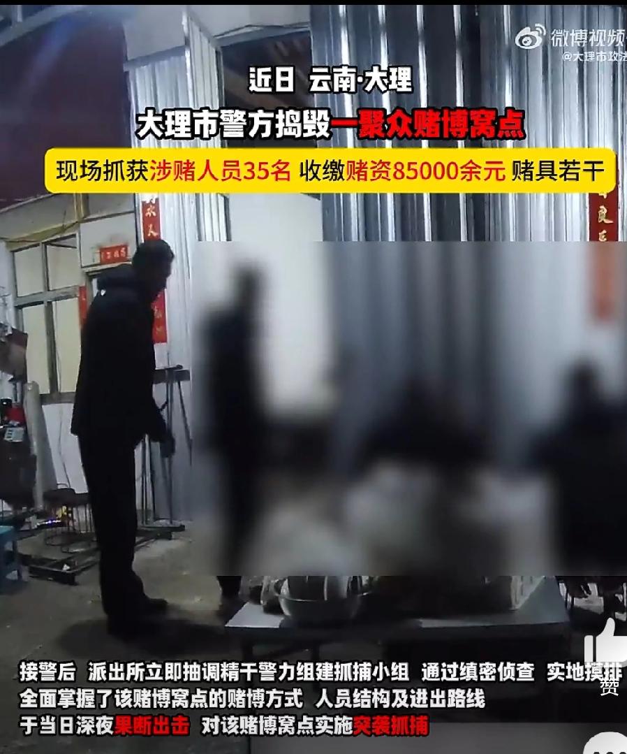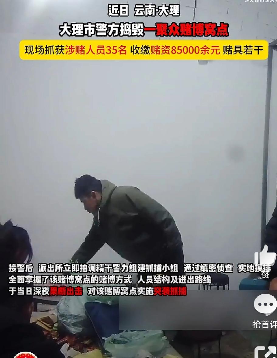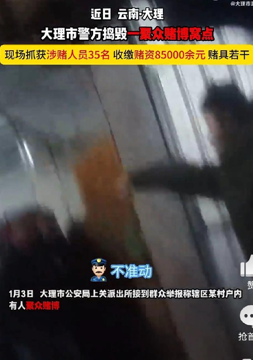 【大理市警方捣毁一聚众赌博窝点】近日,大理市公安局上关派出所接到群众举报称,辖区某村户内,有人聚众赌博。接警后,派出所立即抽调警力,对该赌博窝点实施突袭抓捕,现场抓获涉赌人员35名,收缴赌资8.5万余元,赌具若干。目前,案件正在进一步侦办中。