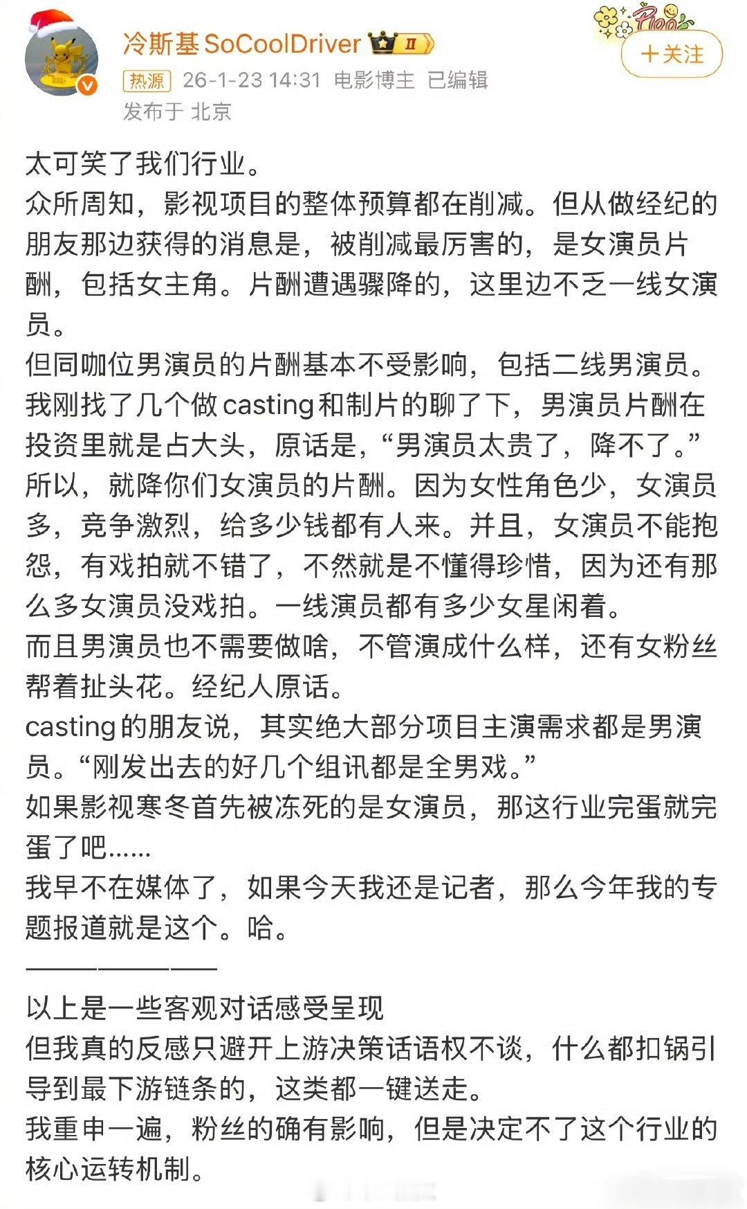 wtf!?影视寒冬寒到的是女演员的片酬,男演员基本不受影响,因为女性角色少女演员多,竞争大 这个讨论现在变成了:同情已经站在金字塔顶端的208更可笑,还是同工不同酬更可恨…业内说现在影视项目预算被削减最厉害的是女演员片酬,包括女主角,且不乏一线女演员但同咖位男演员的片酬基本不受影响,包括二线男演员。绝大部分项目主演需求都是男演员,男演员太贵了,降不了~所以只能降女演员,因为一部戏女性角色少,女演员多,竞争激烈,给多少钱都有人来?!其实更多的是市场选择,因为男演员商业价值相对高点,能拉投 Z 商务广告,粉丝也舍得花钱一些。关于影视圈薪酬,豆瓣说希望208的事208自己解决,同意吗?影视项目 削女演员片酬,影视项目 全男戏