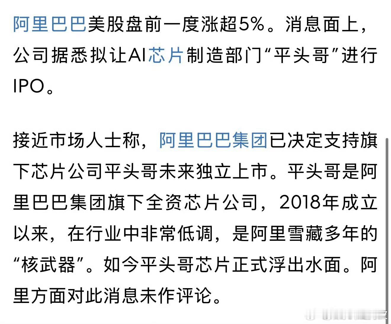 阿里巴巴市值大涨2000亿很多人觉得阿里只靠电商过日子的,怎么可能呢?好多业务都是闷声搞大事,平时不咋吆喝,实力是真藏得住。就说平头哥,搞芯片这么多年不声不响,现在能对标大厂还能自给自足,换谁不得高看一眼。有些人总盯着阿里电商那点事唱衰,挺可笑的。其实人家早把算力、物流、大模型全铺开了,每块业务都很能打。这次市值大涨就是明证,资本市场不瞎,真有技术、有硬核业务,早晚能被看见