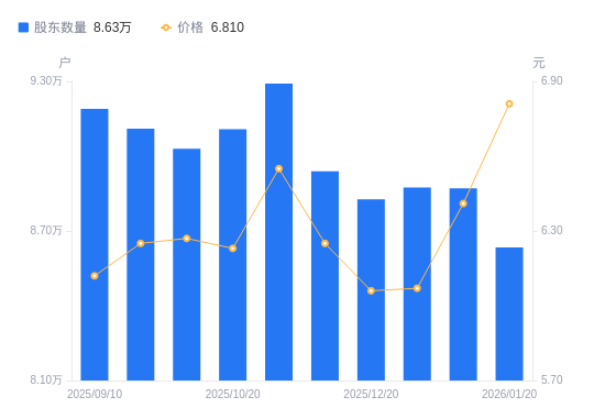 日期A股户数(户)流通A股户均持股数(股)户均持股市值(万元)2026-01-208633620428.5913.912026-01-108870719882.5712.742026-01-018873919875.4012.062025-12-208826519982.1312.112025-11-308939419729.7712.332025-11-109291318982.5212.432025-10-209108519363.4812.062025-09-309029519532.9012.252025-09-209110419304.9012.072025-09-109189219139.3511.71