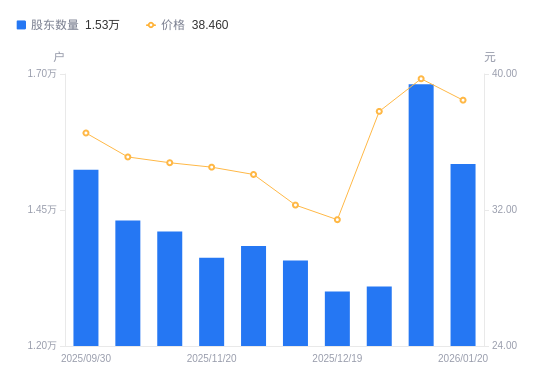 日期A股户数(户)流通A股户均持股数(股)户均持股市值(万元)2026-01-20153445261.9020.242026-01-09168114802.7319.082025-12-31130946166.0823.312025-12-19130036209.2319.522025-12-10135705949.7919.212025-11-28138375834.9819.892025-11-20136215927.5120.462025-11-10141065723.7119.912025-10-20143053063.8010.762025-09-30152412875.6410.50