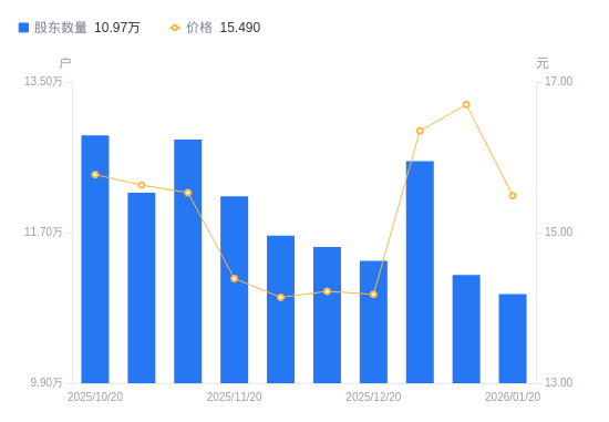日期A股户数(户)流通A股户均持股数(股)户均持股市值(万元)2026-01-201096613524.435.462026-01-101119243453.175.772025-12-311255273078.965.032025-12-201136293401.364.822025-12-101152923352.304.772025-11-301166213314.094.692025-11-201213293185.494.582025-11-101281253016.534.682025-10-311217693173.984.962025-10-201286183004.974.74