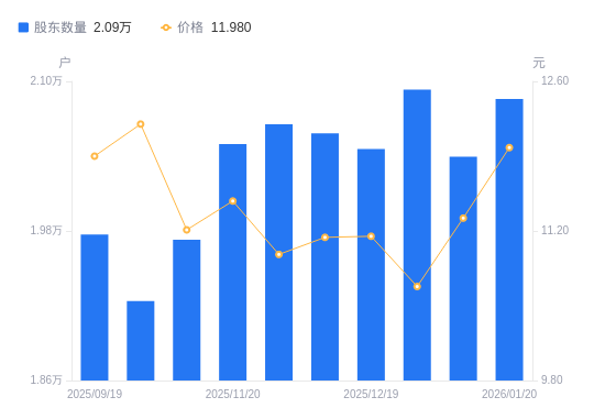 日期A股户数(户)流通A股户均持股数(股)户均持股市值(万元)2026-01-202085850518.5860.522026-01-092039651662.9058.482025-12-312093350337.5853.762025-12-192045751508.8557.432025-12-102058351193.5457.032025-11-282065551335.8956.372025-11-202049651734.1359.392025-10-201973053742.6660.252025-09-301923855117.1067.242025-09-191977153631.1663.82