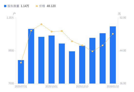 日期A股户数(户)流通A股户均持股数(股)户均持股市值(万元)2026-01-201157615017.6674.042026-01-101135315288.9473.572025-12-311083516019.8772.592025-12-191047716567.2772.662025-12-10987817571.9179.602025-11-28945318361.9385.052025-11-101004617278.0584.322025-10-311065716287.4579.272025-09-301055716441.7382.952025-09-191116115551.9576.08