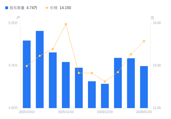 日期A股户数(户)流通A股户均持股数(股)户均持股市值(万元)2026-01-204744810370.7914.672026-01-094836410174.3713.772025-12-314841310164.0712.902025-12-194535710848.8913.292025-12-104565110779.0313.642025-11-284725310413.5913.172025-11-104792010268.6415.352025-10-314905110031.8713.822025-10-20515819539.8212.842025-10-10504469754.4612.66