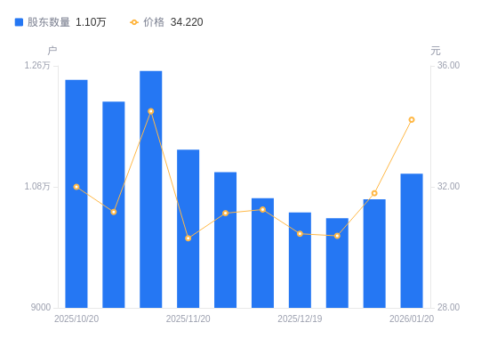 日期A股户数(户)流通A股户均持股数(股)户均持股市值(万元)2026-01-20109952488.098.512026-01-09106162576.928.192025-12-31103352646.988.042025-12-19104182625.908.002025-12-10106312573.288.042025-11-28110182482.907.732025-11-20113512410.067.302025-11-10125232184.517.542025-10-31120662267.257.072025-10-20123912207.787.06