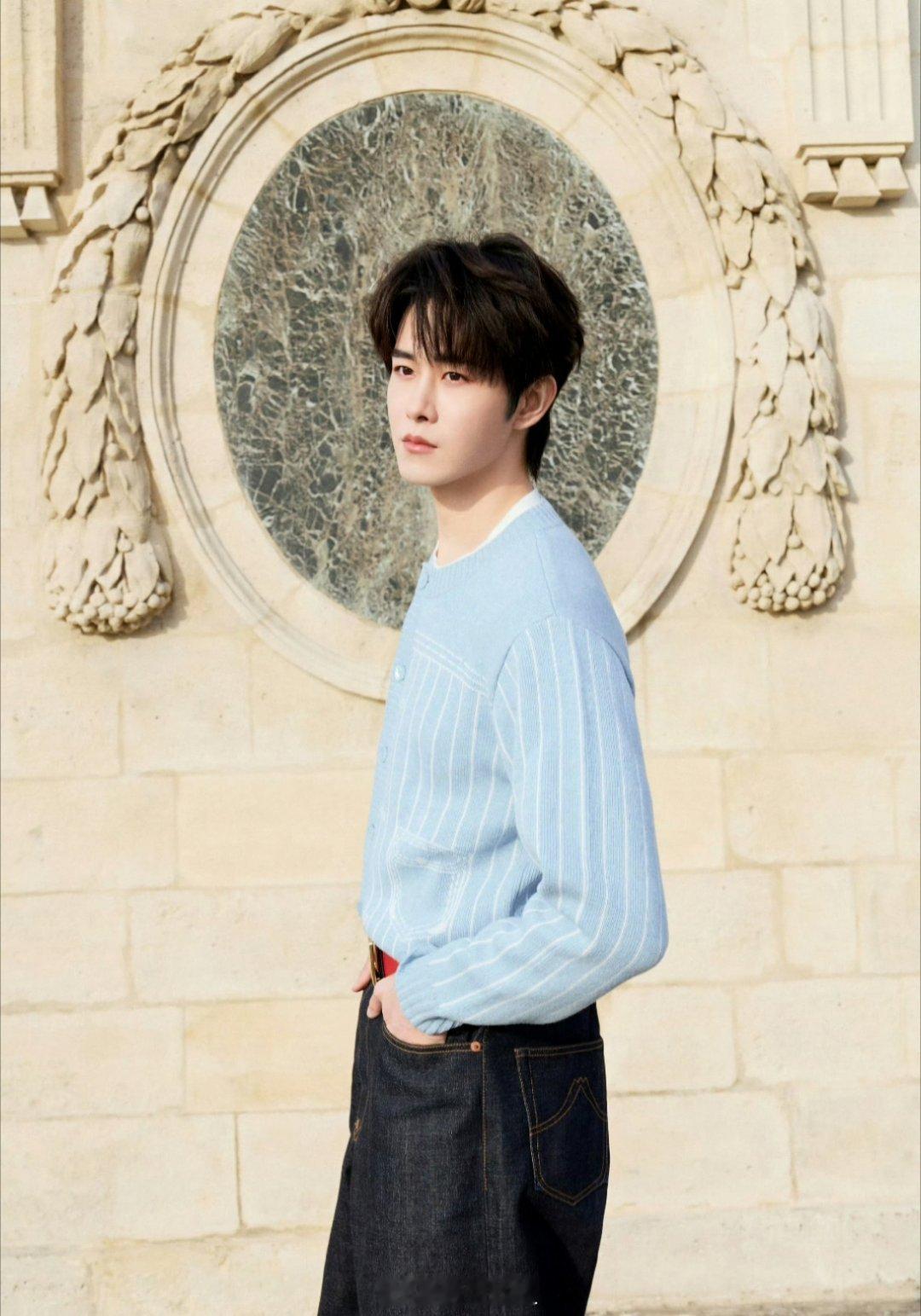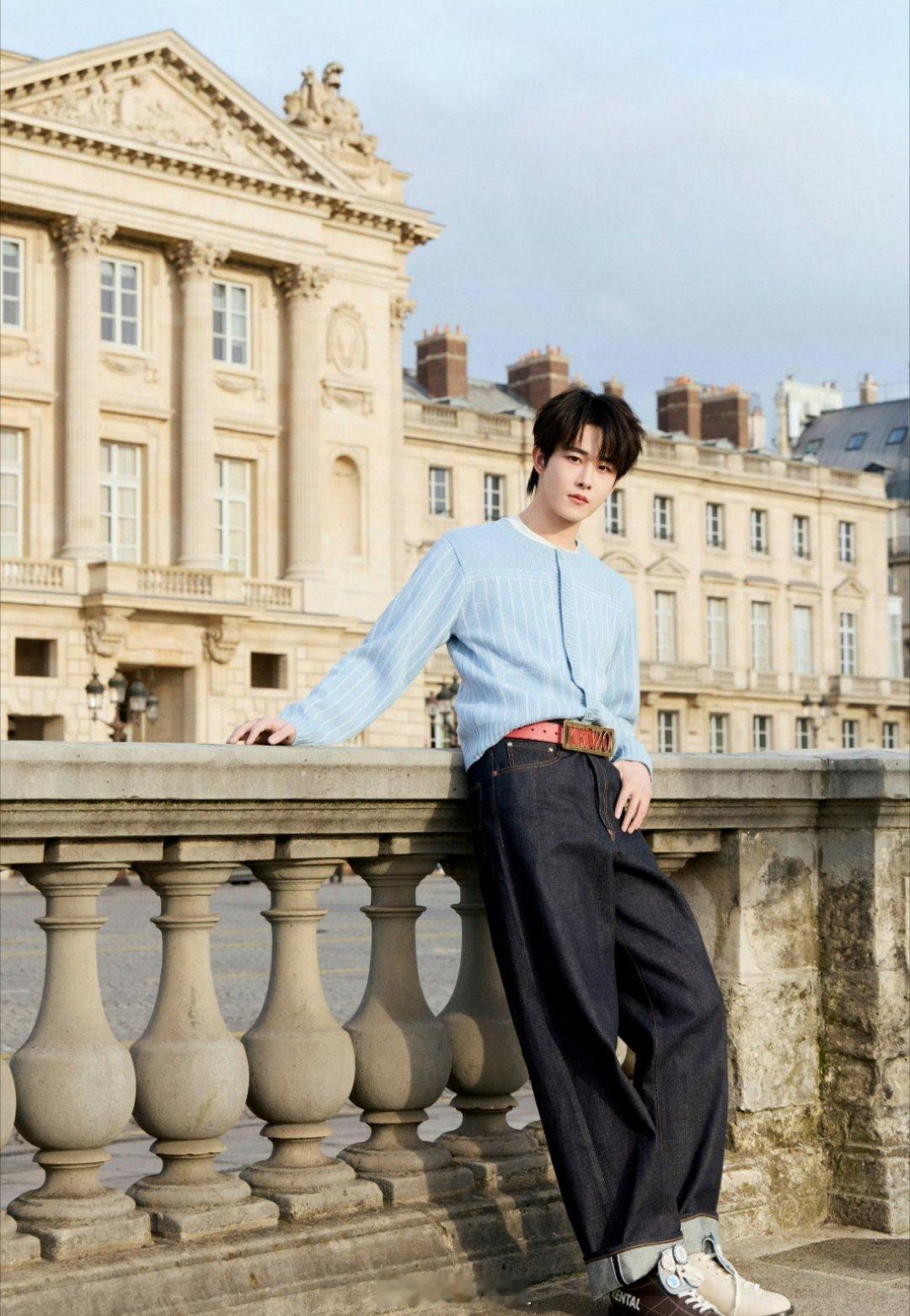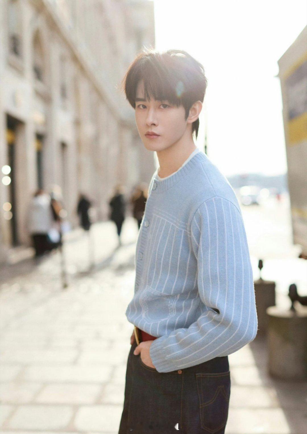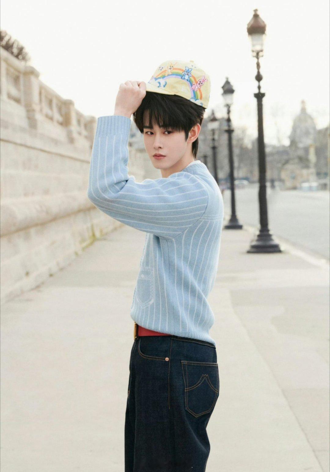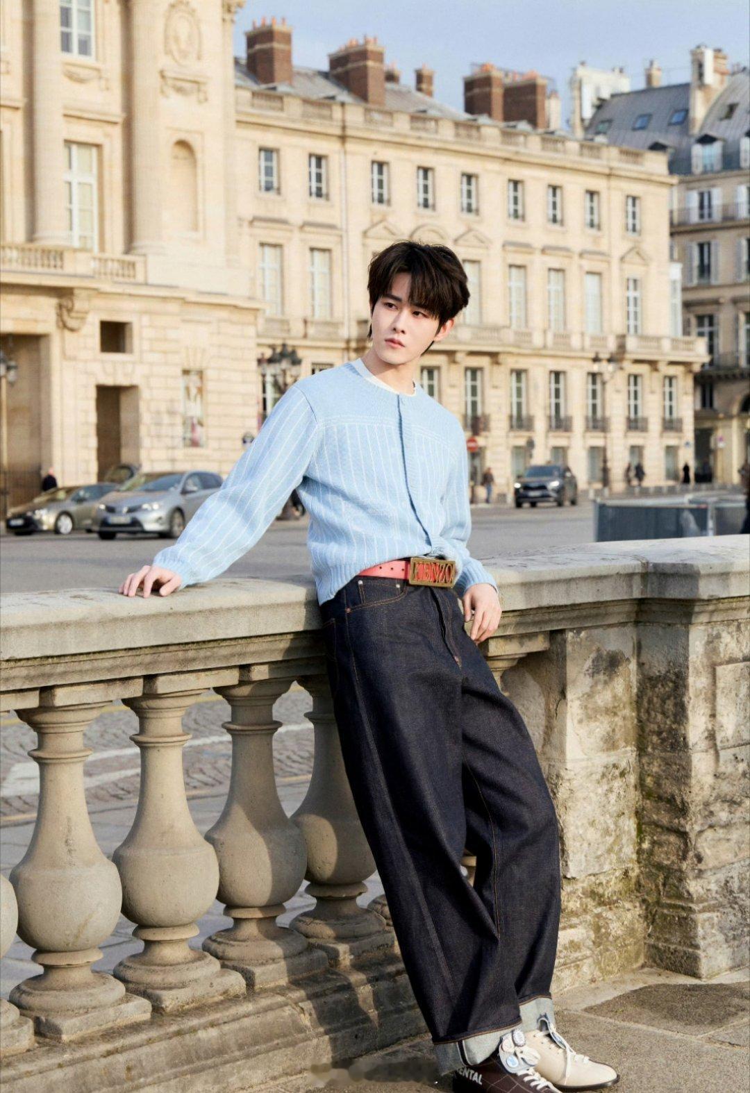 田嘉瑞的巴黎街头图,蓝色的毛衣搭配深蓝色的牛仔裤,小伙子冷冷酷酷的,长的也还行,就是不咋令人印象深刻