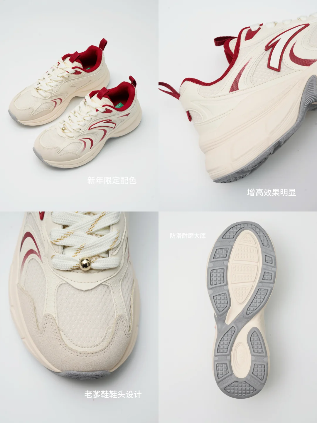最近入手了安踏叶子运动跑鞋,很适合运动健身的时候穿,也很适合当情侣这款。 - 还有好事发生老爹鞋款,红色的是新年限定,因为要新年了,肯定需要一些红元素,来接迎接新年。老爹鞋型复古又有新年气氛,银色就比较适合日常出街通勤啦,送人和自穿都非常很合
