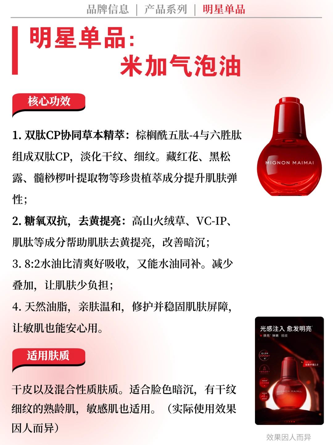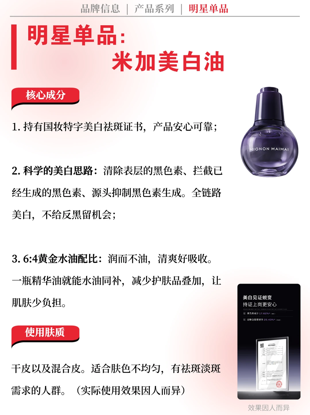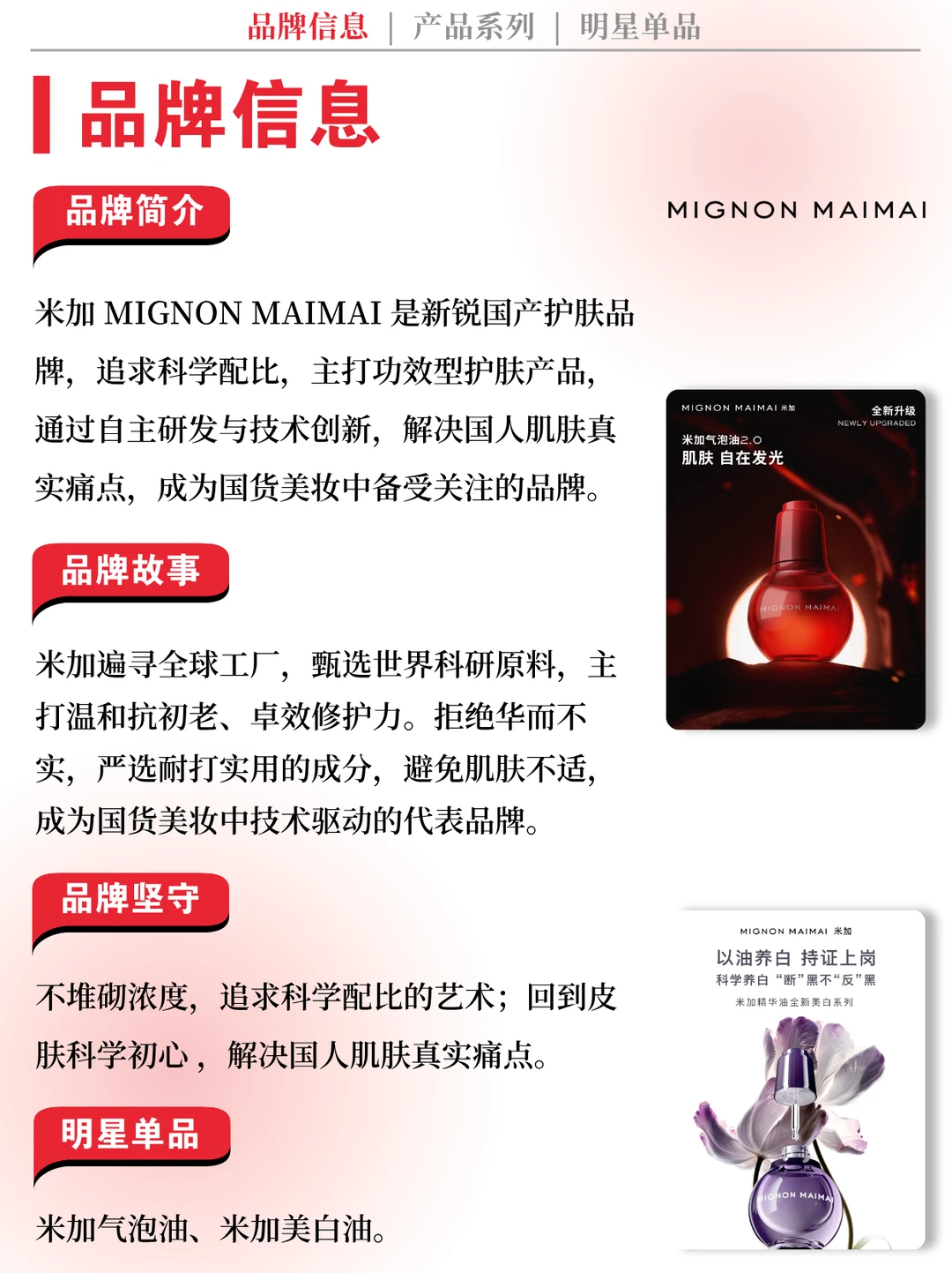 👉 品牌简介:米加MIGNONMAIMAI是新锐国产护肤品牌,追求科学配比,主打功效型护肤产品,通过自主研发与技术创新,解决国人肌肤真实痛点,成为国货美妆中备受关注的品牌。