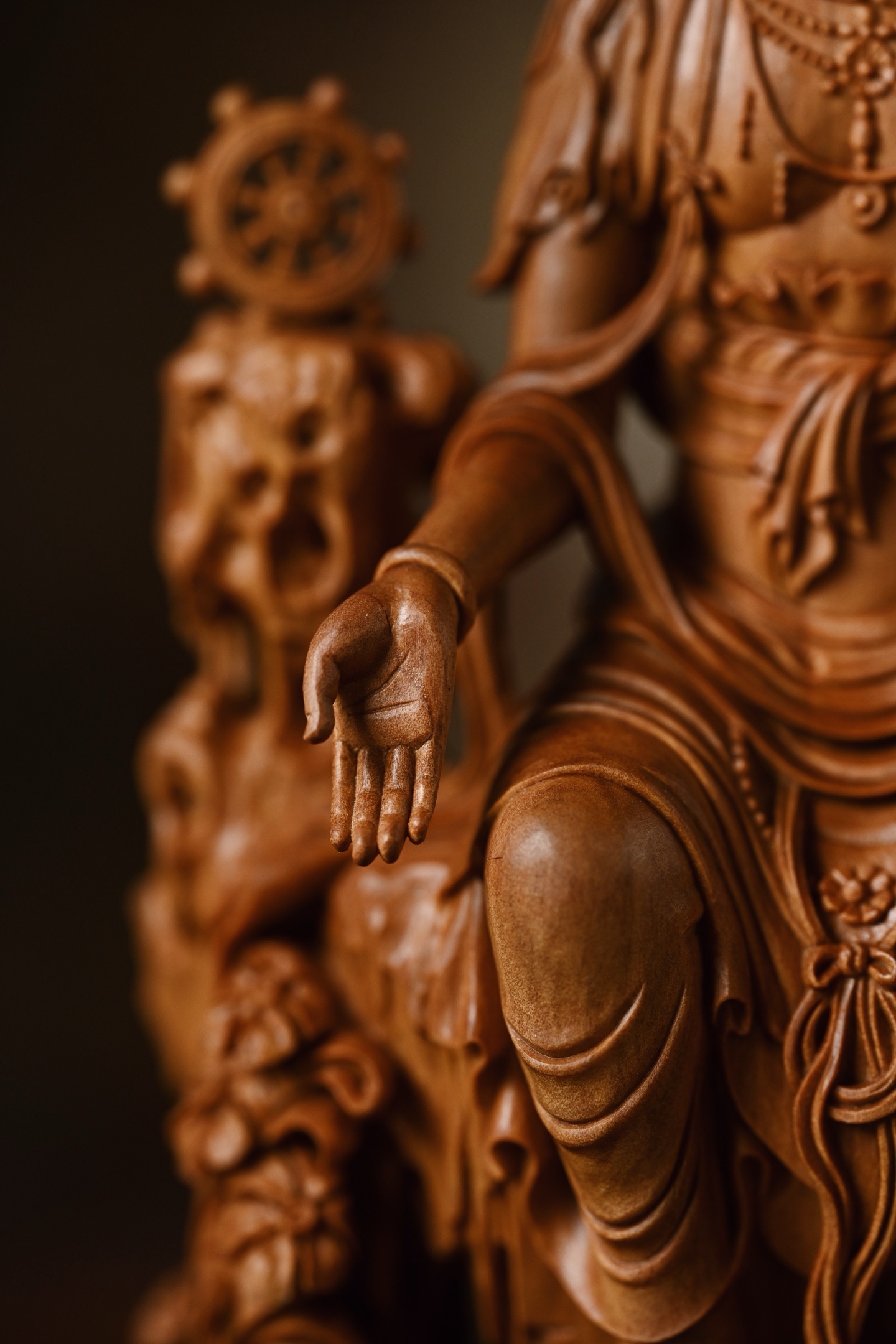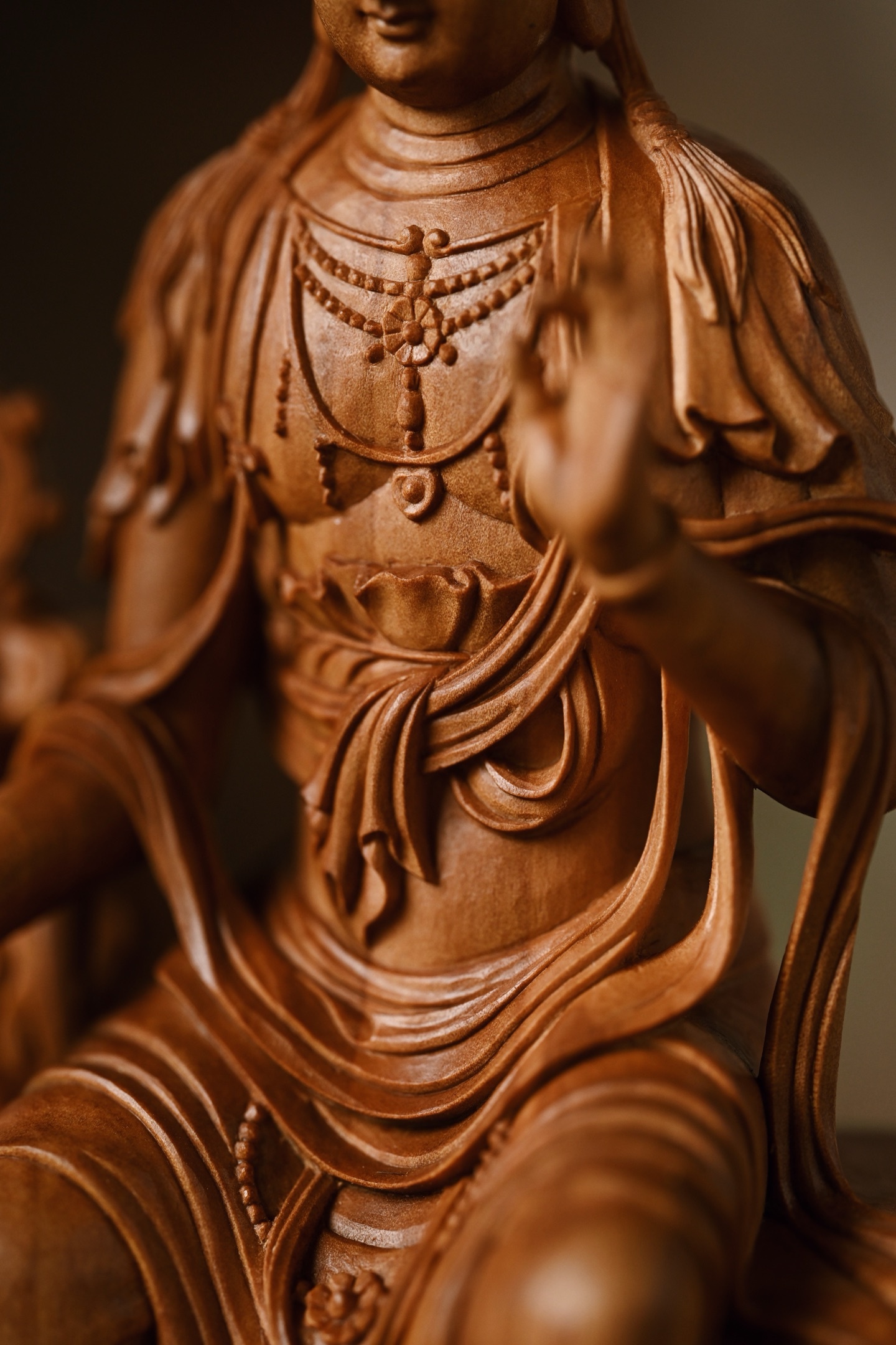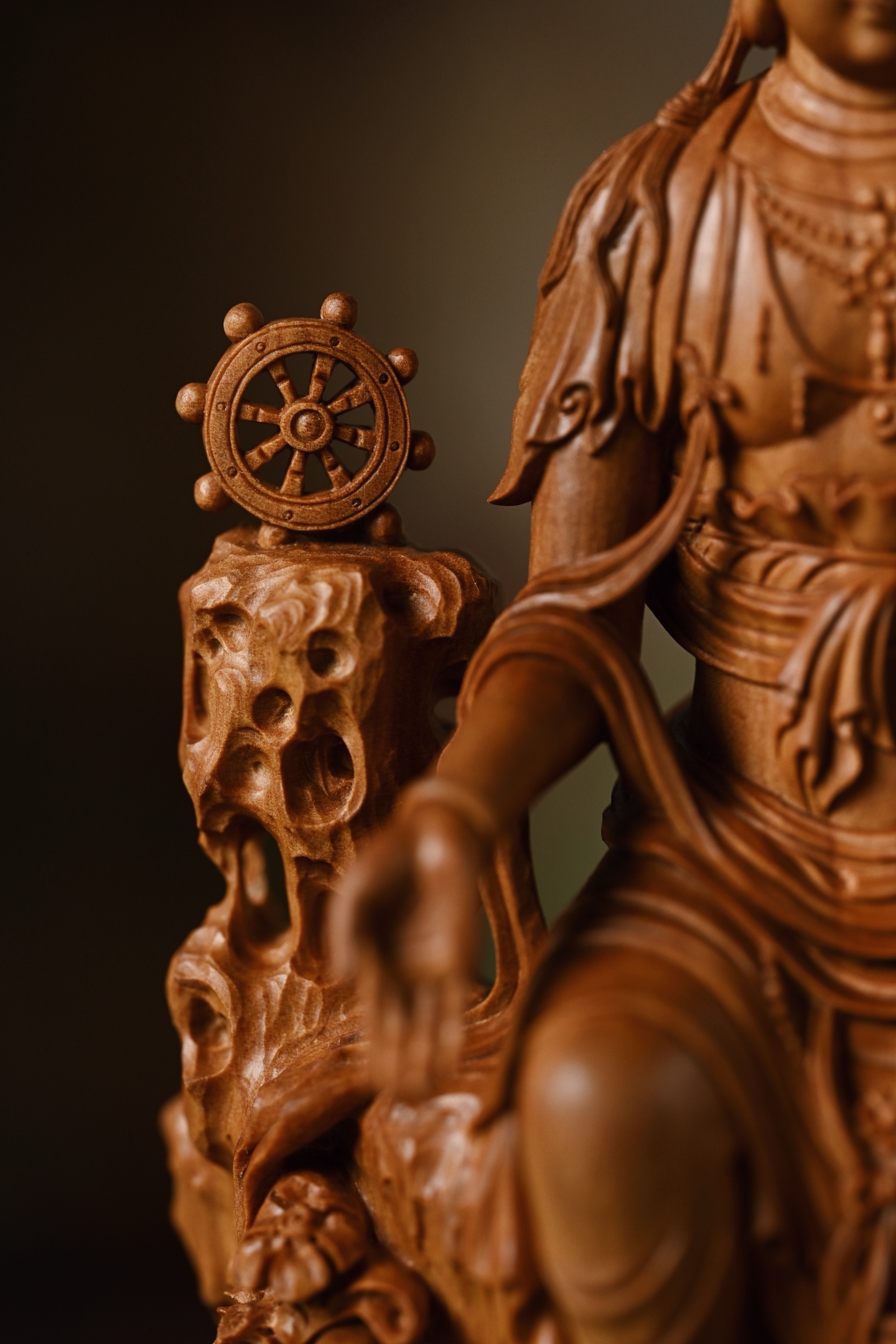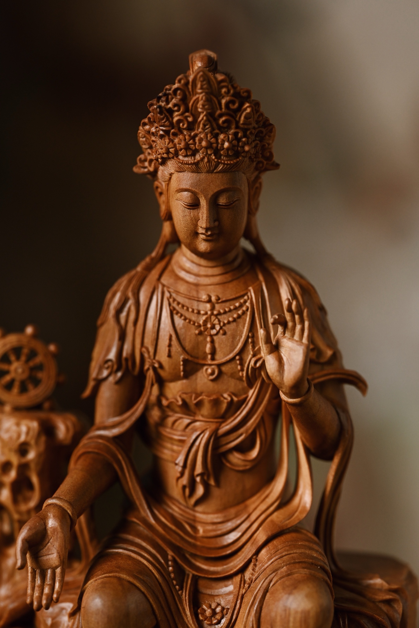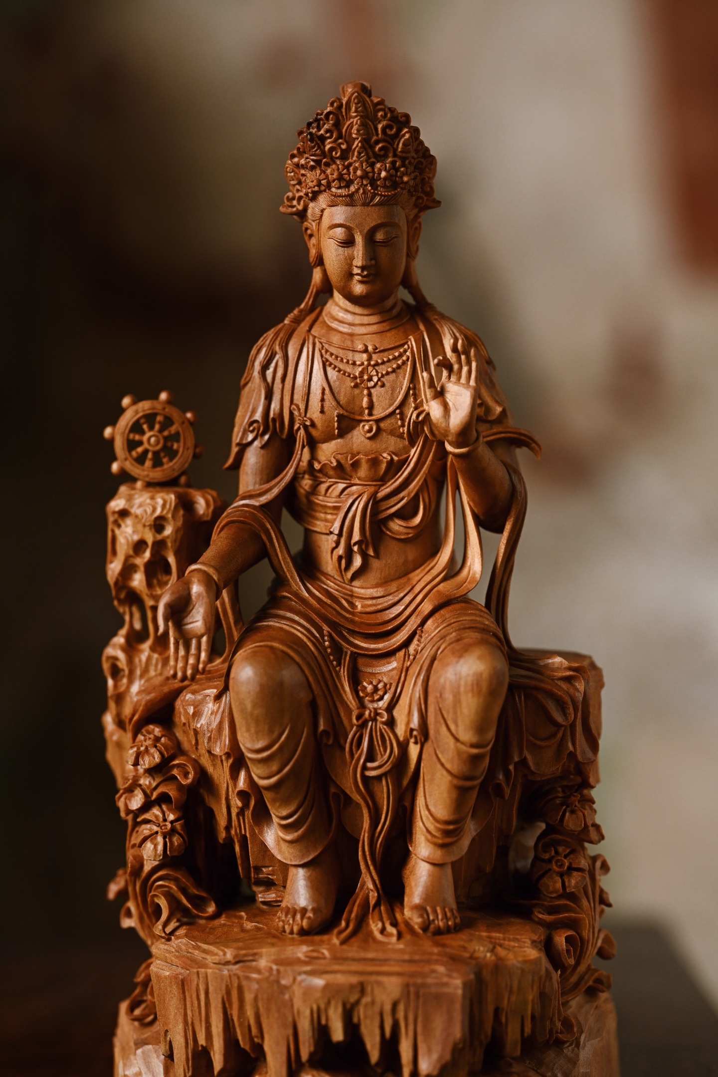 老山檀 | 天冠弥勒菩萨雕刻生动,菩萨头戴天冠坐于石台之上,双手结印,面相饱满,眉如新月,眼微下视,做内观状。身佩璎珞,着贴体宝衣,庄重凝静,威严肃穆。10*7*20cm 397g