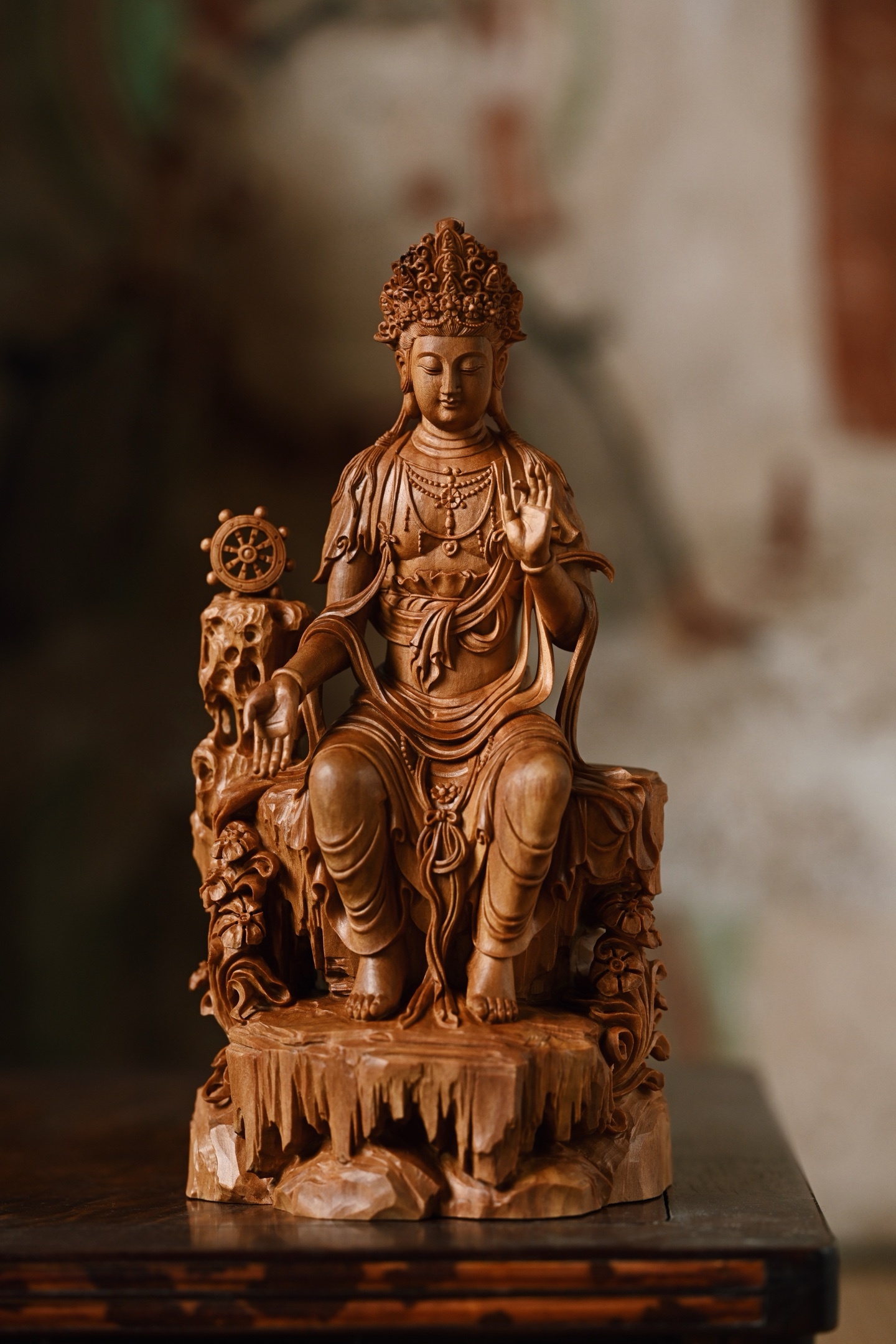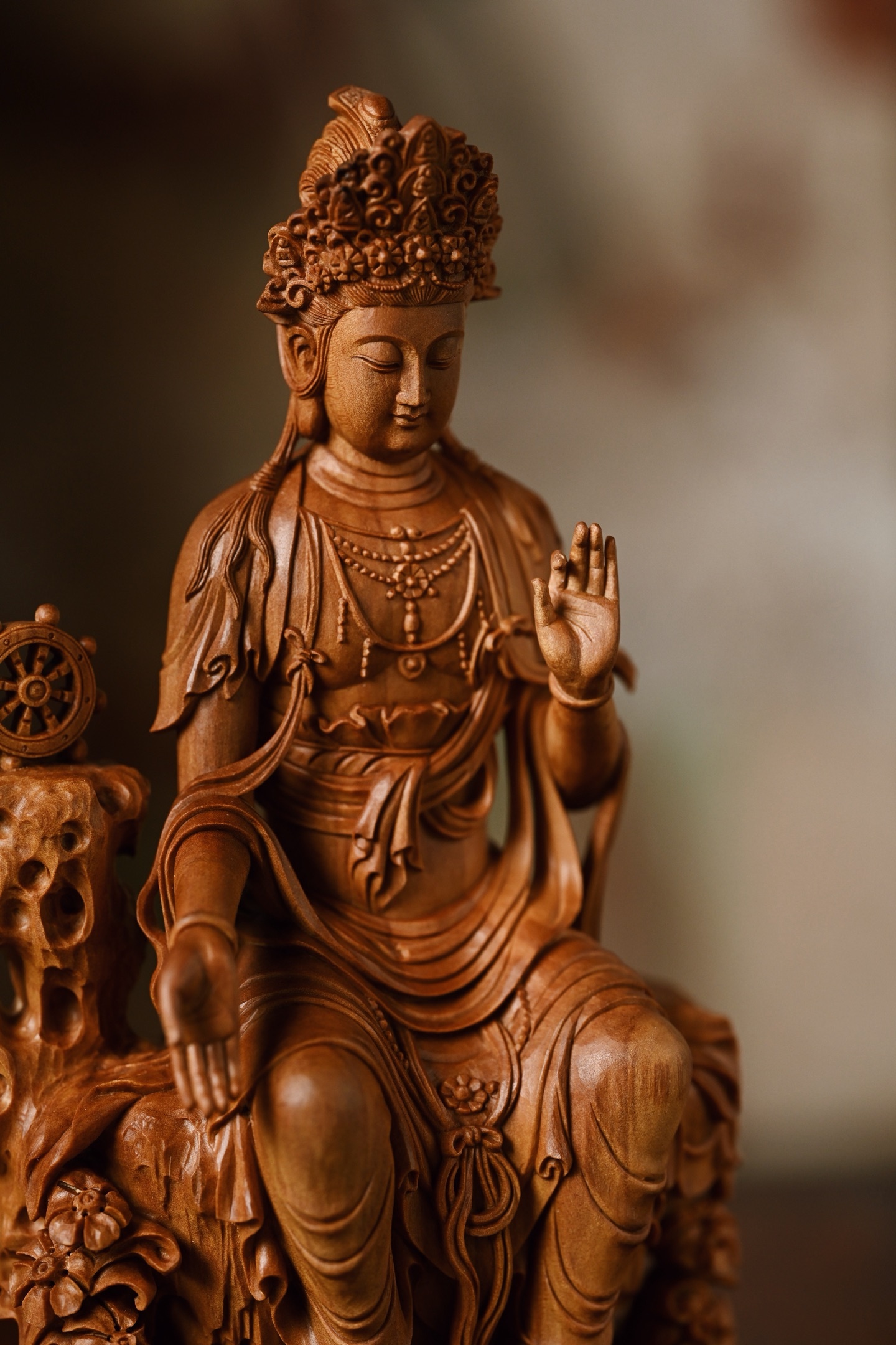 老山檀 | 天冠弥勒菩萨雕刻生动,菩萨头戴天冠坐于石台之上,双手结印,面相饱满,