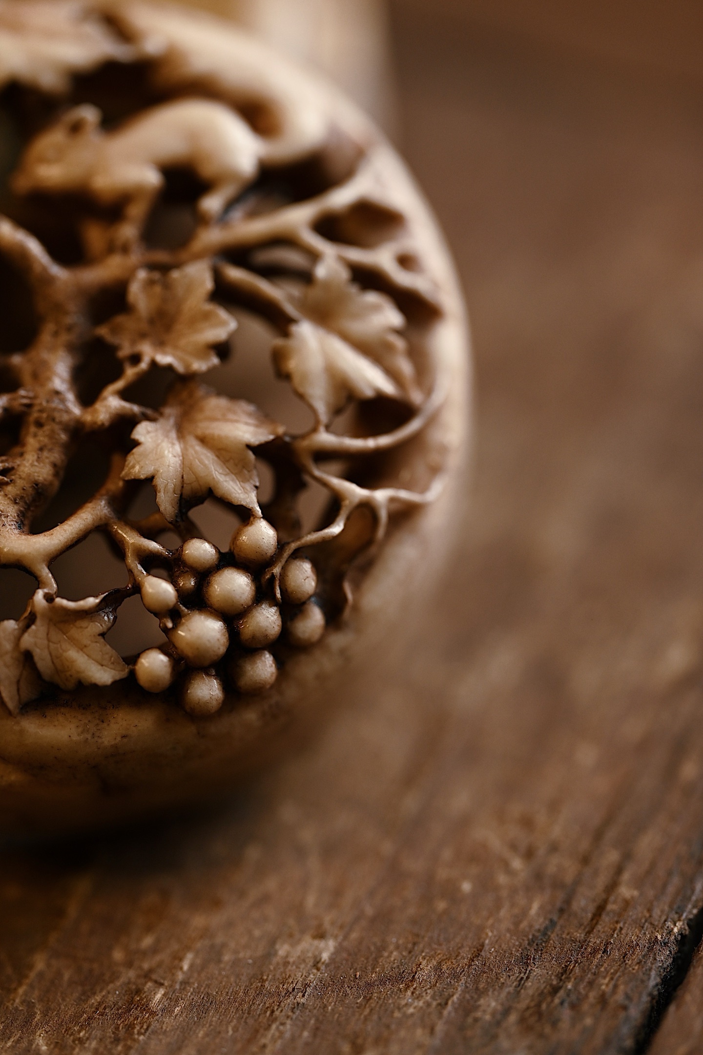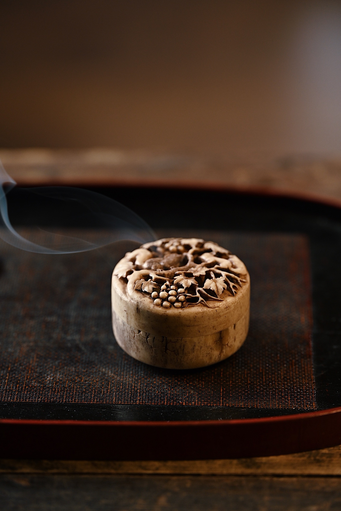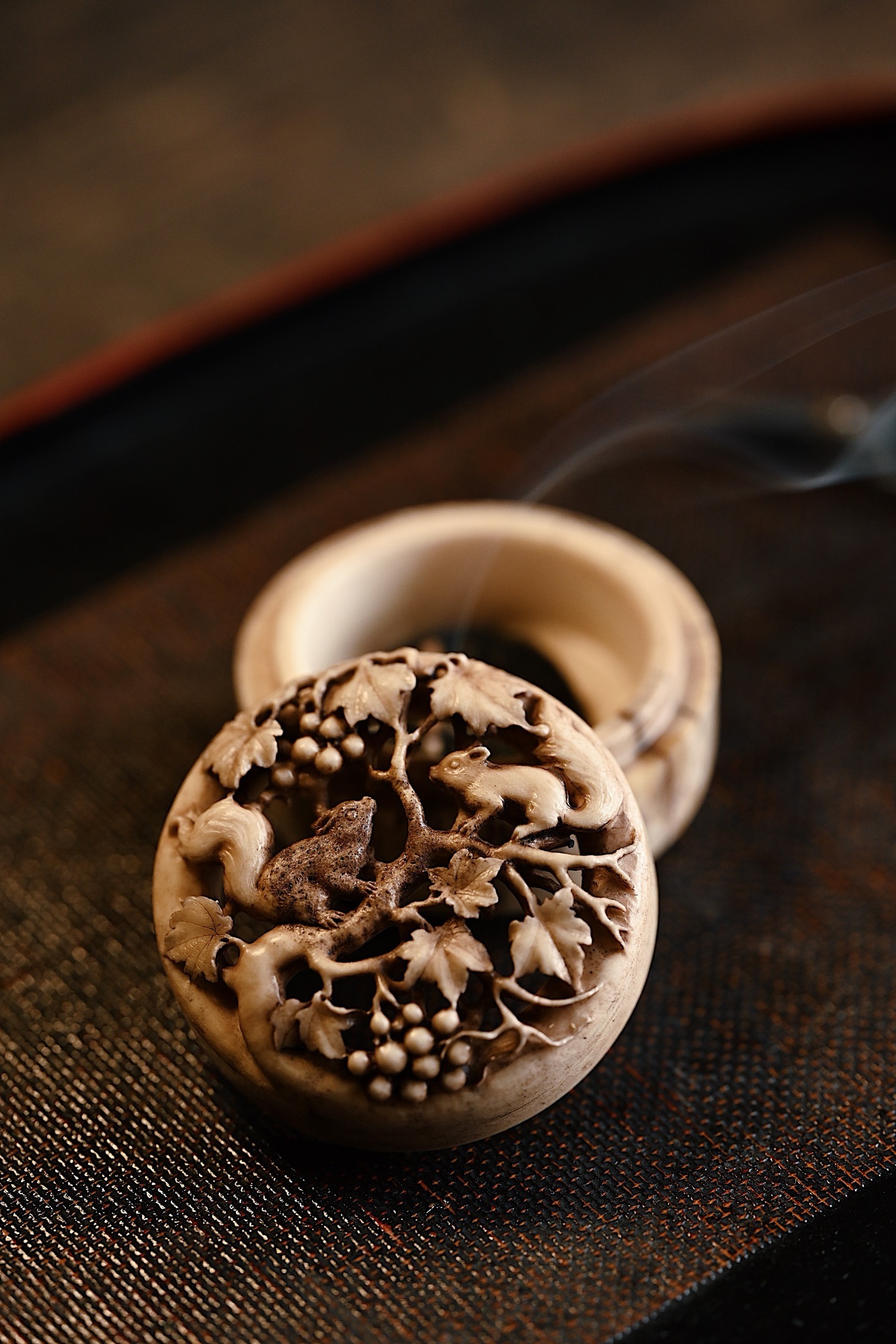 鹿角仿古 | 多子多福 迷你小香炉尺寸小巧迷你,仿古风格,炉盖雕刻松鼠佳果,满目天真野趣,辅以香事,妙如佳画。5.2*5.2*3.5cm 67g