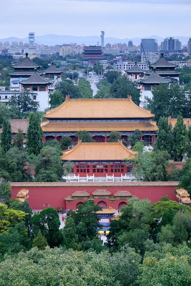 景山寿皇殿金黄琉璃瓦与朱红宫墙尽显威严,依中轴线对称布局,气势恢宏。其旁现代建筑林立,古今同框,似历史与现实对话,展现北京独特韵味与时代变迁。