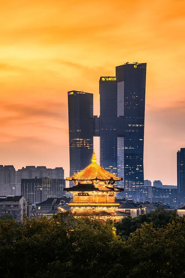 夜幕降临,南京赏心亭与金鹰世界同框。赏心亭飞檐翘角,古韵悠然;金鹰世界灯火璀璨,现代时尚。二者相互映衬,演绎着南京这座城市古今交融的独特魅力,令人陶醉。