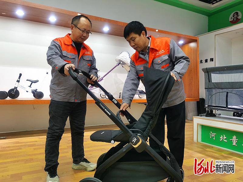 1月21日,在河北童翔童车有限公司商品展示区,总经理温志朝(右)与技术人员展示高景观婴儿推车各项功能。河北日报记者陈正摄