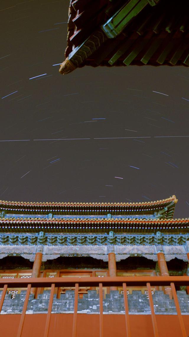 1月24日在北京使用智能天文望远镜拍摄的中国空间站从故宫上空飞过的轨迹(画面中部横线)。