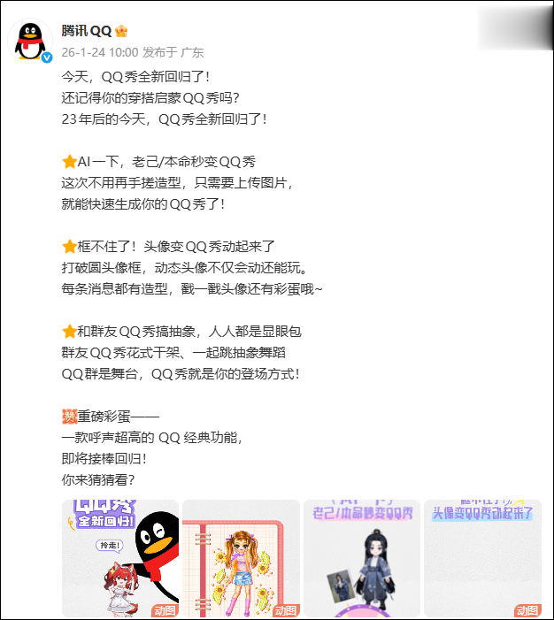 1月24日,腾讯QQ宣布QQ秀回归,手机QQ搜索“QQ秀”即可使用。QQ秀于2003年1月24日上线,而此次更新恰逢23年纪念日。