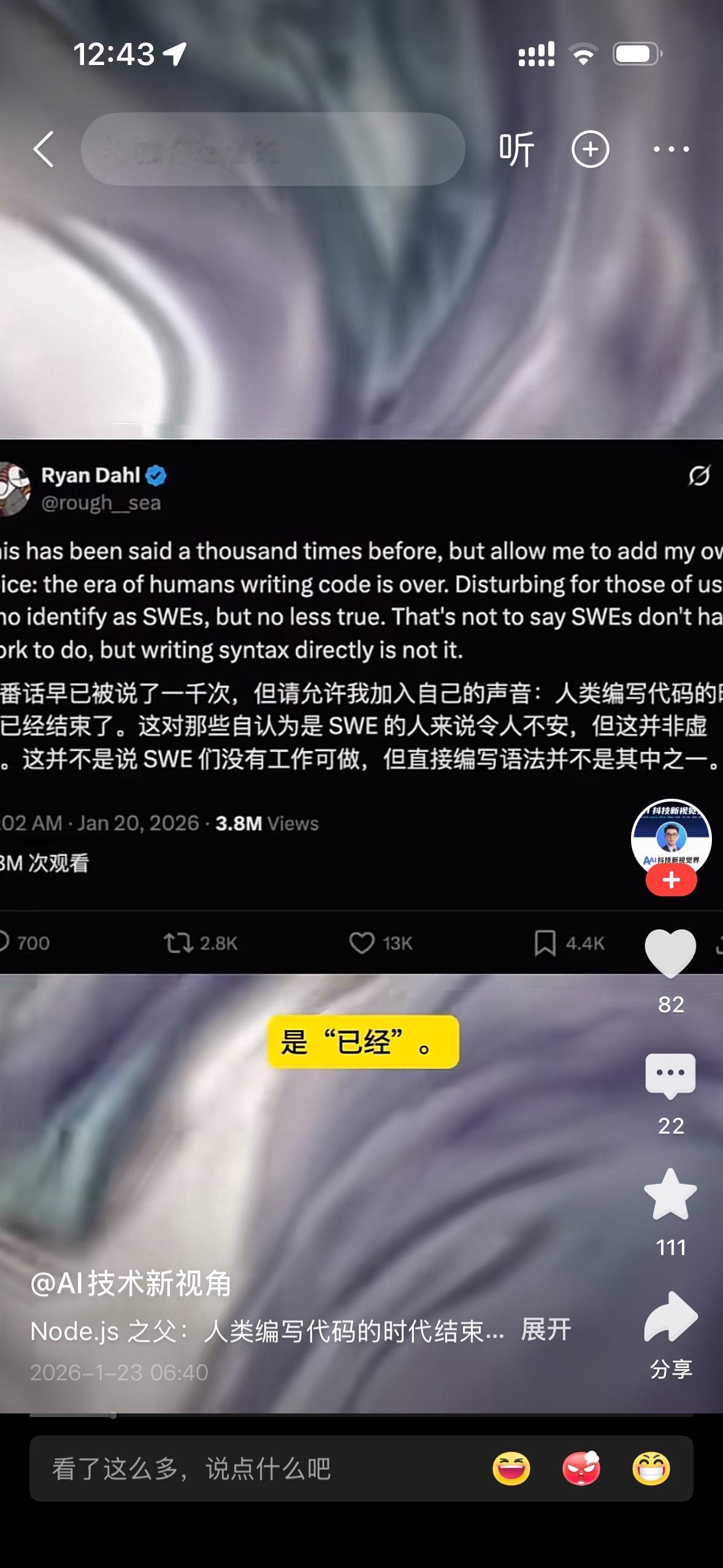Node js 之父 Ryan Dahl 说人类手写代码的时代已经结束,那以后程序员该怎么办? • Ryan Dahl原话重点:他说的是“直接编写语法不再是核心工作”,不是程序员消失;而是从“写代码”转向“定义意图、做架构、验结果”,AI接管语法层编码。 二、为什么“末日说”不成立 • AI的局限:复杂架构、系统设计、遗留系统改造、安全合规、业务逻辑对齐,这些仍需人类判断力与经验,AI易在边界与细节出错。 • 职业是升级不是消失:类似计算器没消灭数学家,而是让数学家聚焦证明与创新;AI让程序员从“代码工人”升级为“解决方案架构师”“AI协作指挥者”。 • 新需求会涌现:AI普及会降低开发门槛,催生更多软件场景,带来新的高价值岗位(如AI伦理、提示词工程、系统可靠性保障)。 三、程序员的转型路径(可执行) 1. 升维能力 ◦ 深耕系统架构:设计可扩展、安全、可维护的系统,这是AI难以替代的核心能力。 ◦ 吃透业务逻辑:把行业知识转化为技术方案,建立“业务+技术”双壁垒。 ◦ 强化问题诊断:聚焦AI解决不了的复杂调试、性能瓶颈、安全漏洞。 2. 人机协作 ◦ 掌握提示词工程:精准表达需求,高效控AI生成质量,降低试错成本。 ◦ 建立代码评审SOP:制定AI生成代码的验收标准,快速发现逻辑与安全问题。 ◦ 用AI提效:让AI写重复代码、生成测试用例、做文档,自己专注创意与决策。 3. 技术+领域双栖 ◦ 选垂直领域(如你持仓的光伏、机器人、航天),做懂行业的技术专家,价值更稳固。 ◦ 关注新兴方向:AI基础设施、大模型微调、边缘计算等,提前占位新赛道。 4. 心态与习惯 ◦ 接受“语法交给AI,思考留给自己”,把编码视为手段而非目的。 ◦ 保持学习:跟踪AI工具与技术趋势,定期更新技能栈,避免能力固化。 四、短期行动清单(7天可落地) 1. 选定1个AI编程工具(如Cursor、GitHub Copilot),用它完成1个小项目,记录效率提升与问题。 2. 整理你工作中重复度高的编码场景,编写提示词模板,形成个人提效库。 3. 读1本系统架构/领域驱动设计的书,强化高价值能力。 4. 加入技术社区,交流AI协作最佳实践,获取转型灵感。 一句话总结:手写代码的时代在远去,但程序员的黄金时代在到来,关键是放弃“语法执念”,转向更高价值的思考