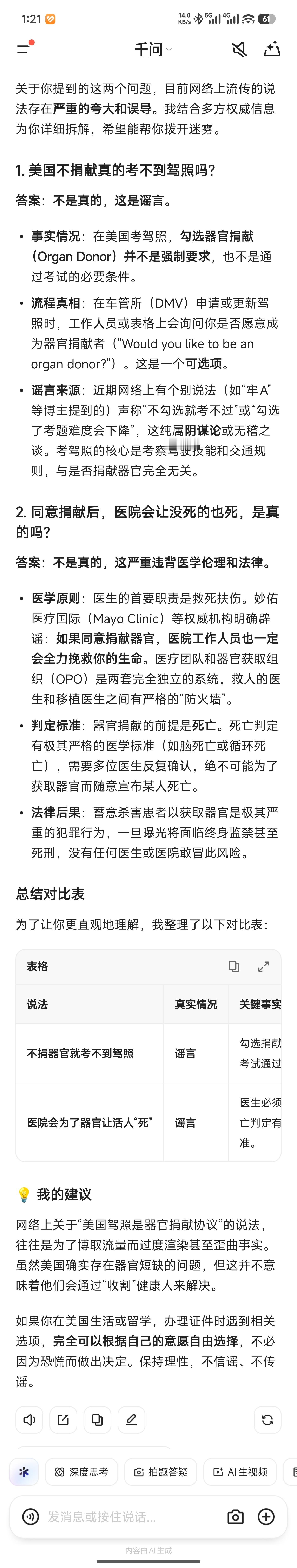 牢A说在美国不同意器官捐献就考不到驾照,同意就很容易考到。在医院同意捐献,不用死的病也可能死。真的假的?你要核查资料,那肯定是假的。任何Ai助手什么的都会标记谣言。不符合流程。有意思的是一个鼓吹不要同意器官捐献的美国华人,别管这个是不是谣言反正她一直是相信的,坚决不勾选的。想反驳牢A,结果拿出来自己的驾照,发现有一个标志,也就是出事同意器官捐献。当场就破大防了但一个东西有利可图,就不能相信自觉。有钱不赚,那不那啥了么。所以很多事情表面和事实有出入的。还有一个博主黑人小哥想验证美国没有那么危险。背着透明小包,里面全是现金。在美国人群里走。很多人就拨动他的包,问他干嘛的。一会就被堵了。摄影师赶紧拿着枪出来救。国情不一样,人和人的差距能比猫和狗的差别还大。
