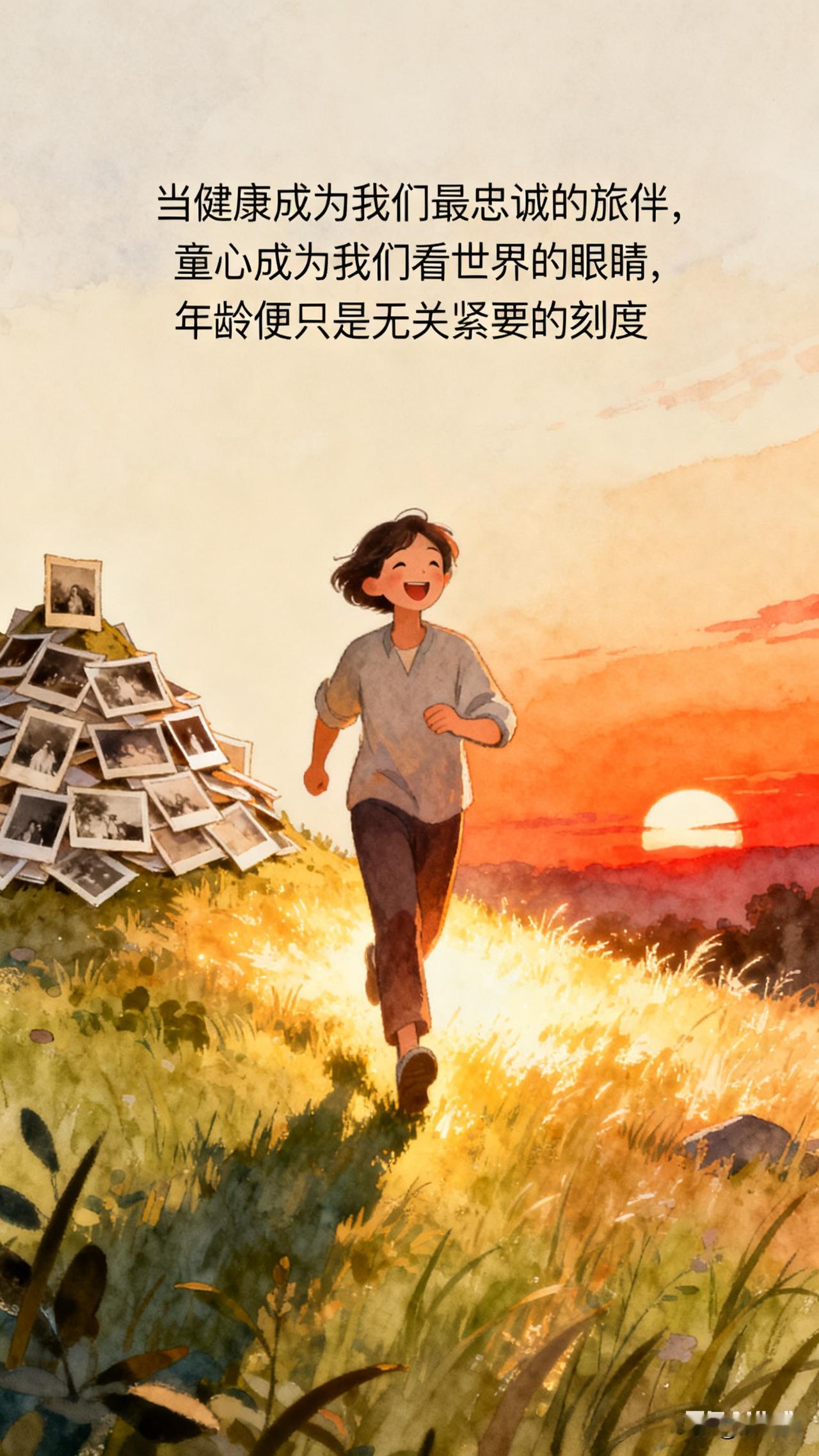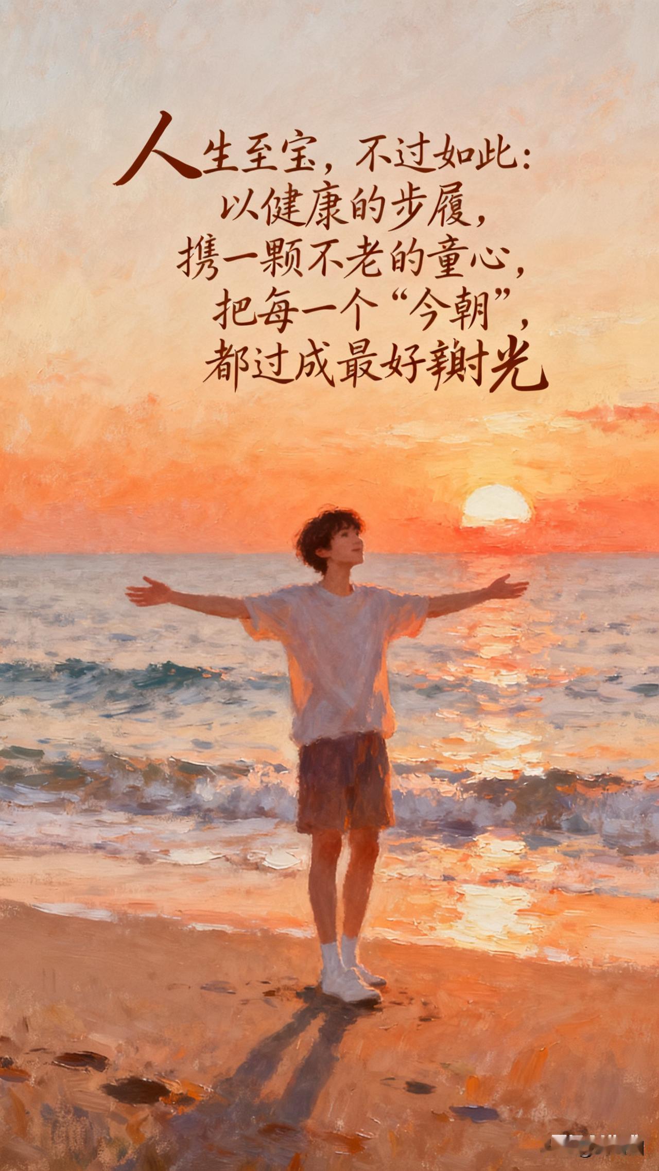 人生最好的投资:健康为底,童心为利,过好每一个“今朝” 岁月尽头,最昂贵的奢侈品是童心 我们总以为生命是一场不断获取的旅程,直到某个时刻才恍然发现,真正的“宝”,不过是健康地走到最后,从容地看夕阳落下。那些曾经浪漫的昨天,是生命赋予我们的本金;依然美好的今朝,是时光结算的利息。而所谓“长生不老”的妄念,终于在与岁月和解后,化为一个更朴素的愿望:但求日日都好。 这份“好”不在别处,恰恰在于那份历经世事后依然清澈的“童心”。它并非不谙世事的天真,而是一种选择——选择在见识过复杂后,依然为一片流云驻足;在承受过重量后,依然能被一声鸟鸣治愈。它是灵魂的柔光镜,滤去生活的粗粝,让每一个平凡的日子,都能泛起细腻温暖的光泽。身体会听从自然的律法,但心灵可以永远住在自己的春天。 当健康成为我们最忠诚的旅伴,童心成为我们看世界的眼睛,年龄便只是无关紧要的刻度。浪漫的昨天已存入记忆,不必频频回首;美好的今天正握在手心,当全心感受;而明天的夕阳,不过是又一个值得期待的、平常的黄昏。人生至宝,不过如此:以健康的步履,携一颗不老的重心,把每一个“今朝”,都过成最好的时光。