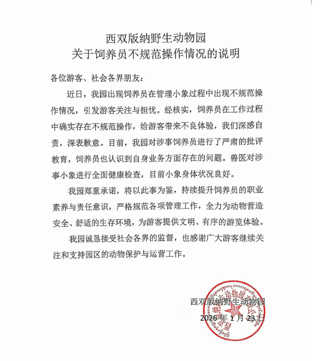 紫牛新闻记者了解到,目前西双版纳野生动物园已对此进行了回应。动物园表示,经核实,饲养员在工作过程中确实存在不规范操作,给游客带来不良体验,深感自责,深表歉意。“目前,我园对涉事饲养员进行了严肃的批评教育,饲养员也认识到自身业务方面存在的问题。兽医对涉事小象进行全面健康检查,目前小象身体状况良好。”动物园方面表示,将以此事为鉴,持续提升饲养员的职业素养与责任意识,严格规范各项管理工作,全力为动物营造安全、舒适的生存环境,为游客提供文明、有序的游览体验。