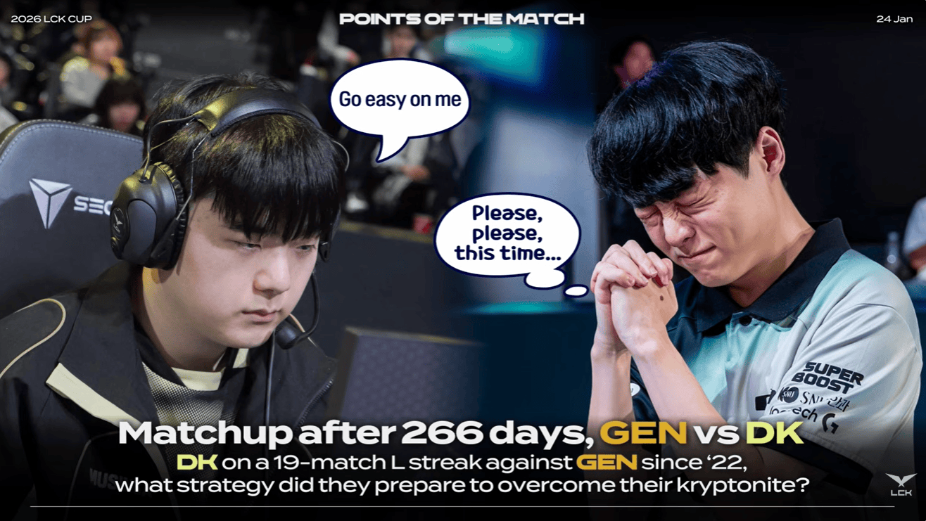 DK与GEN时隔266天再次交手,此前DK对战GEN已19大场连败。