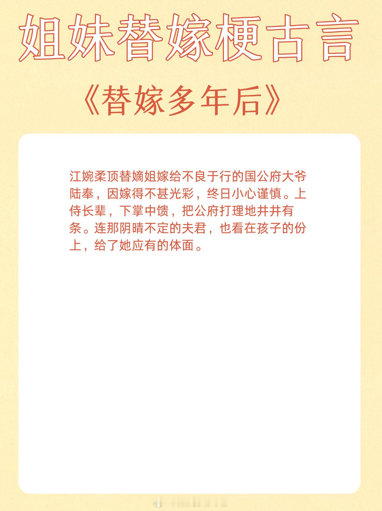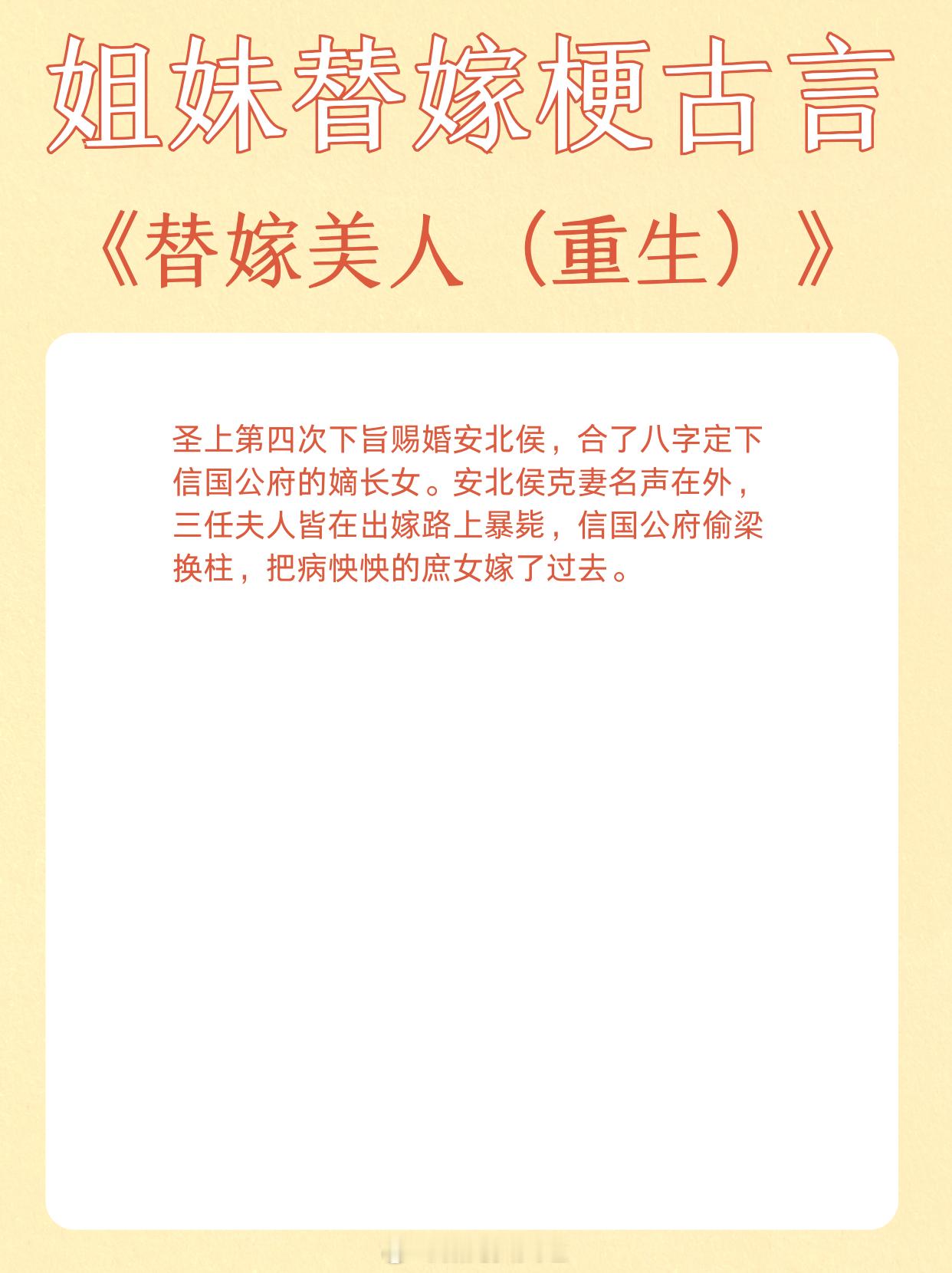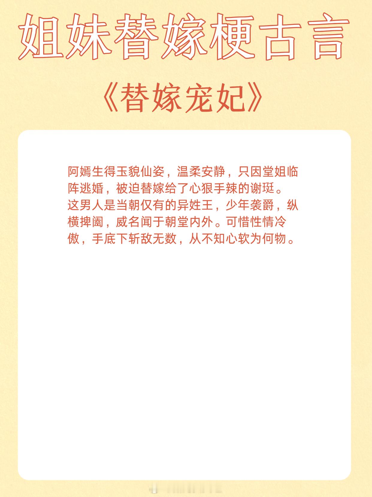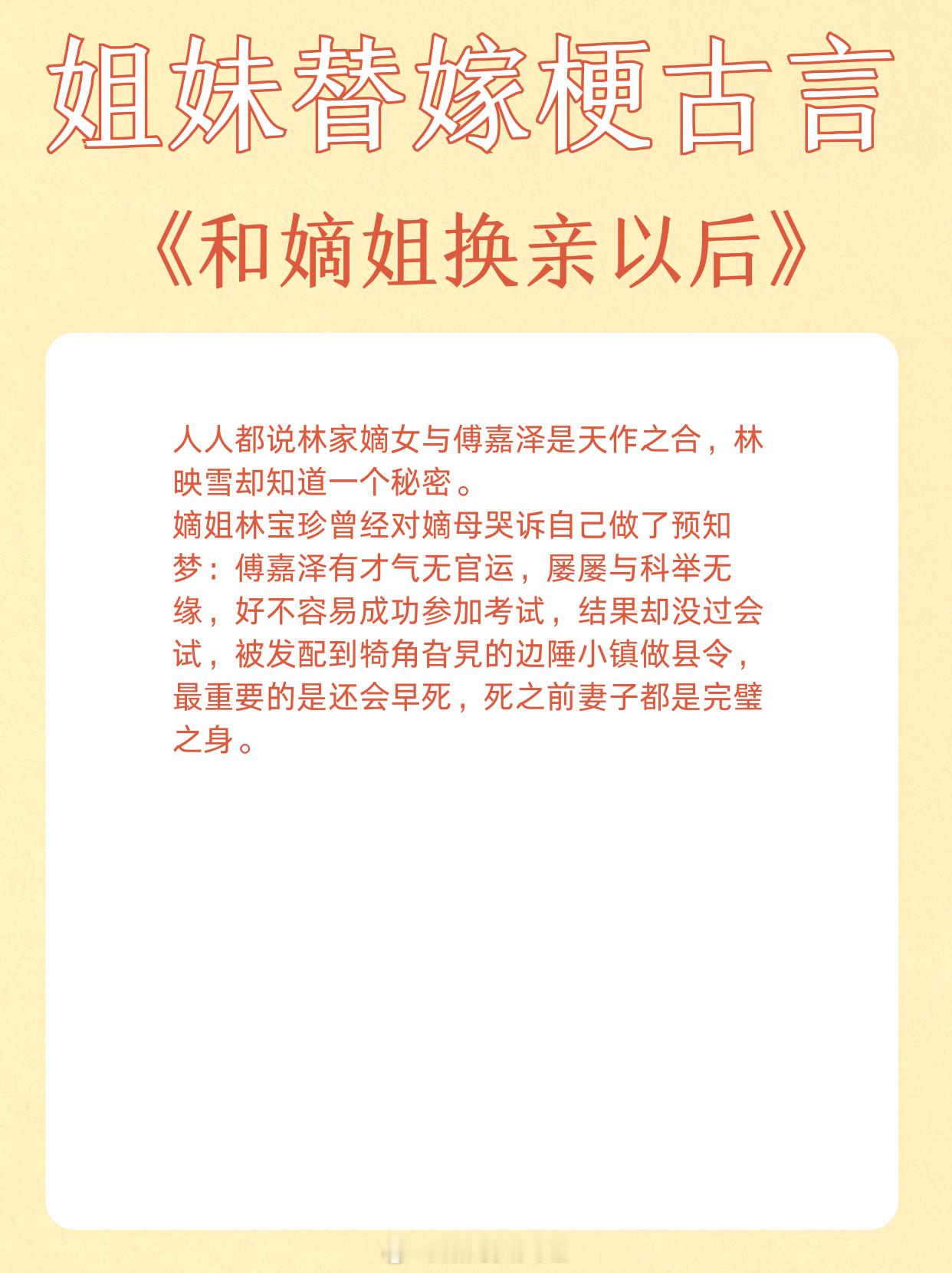 姐妹替嫁梗古言,青丝到白发,独占君心不悔。1、《替嫁多年后》作者:宁夙2、《和嫡姐换亲以后》作者:沉云香3、《玉露凝棠》作者:一枝嫩柳4、《换嫁春风》作者:明春鸢5、《替姐姐嫁给反派后》作者:二恰6、《折腰》作者:蓬莱客7、《替嫁宠妃》作者:归去闲人8、《替嫁美人(重生)》作者:柚一只梨9、《宠上眉梢》作者:乔燕这小说写在我心趴上了 这小说硬控我十分钟