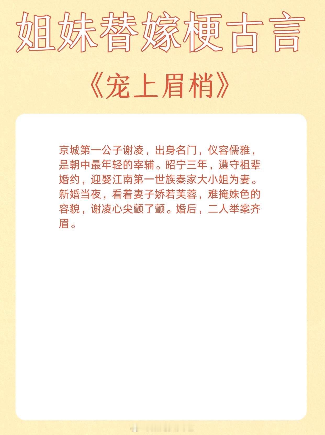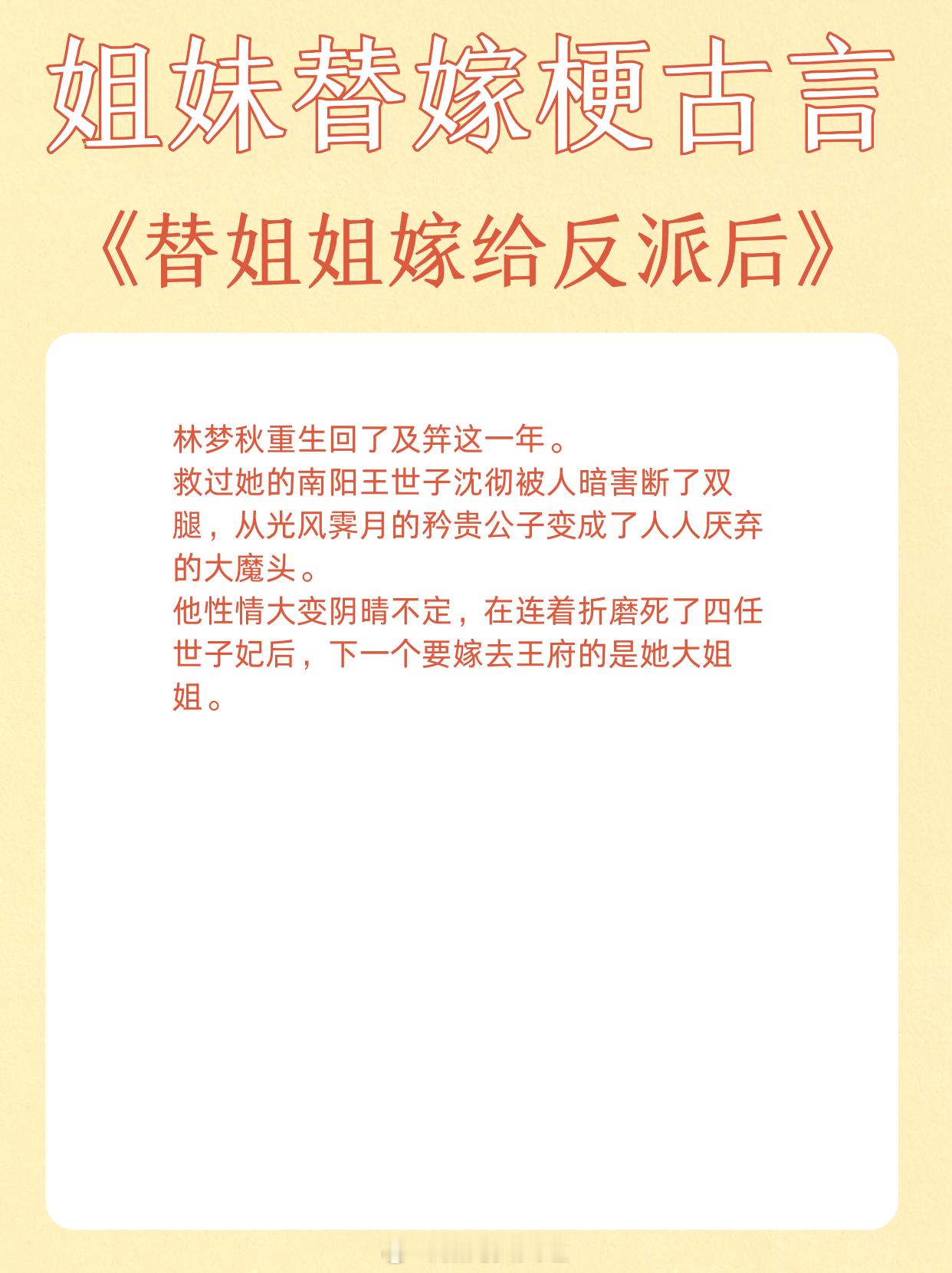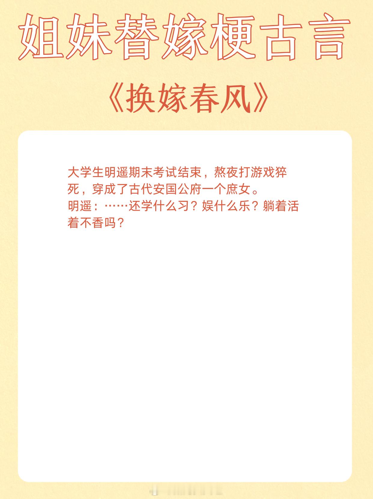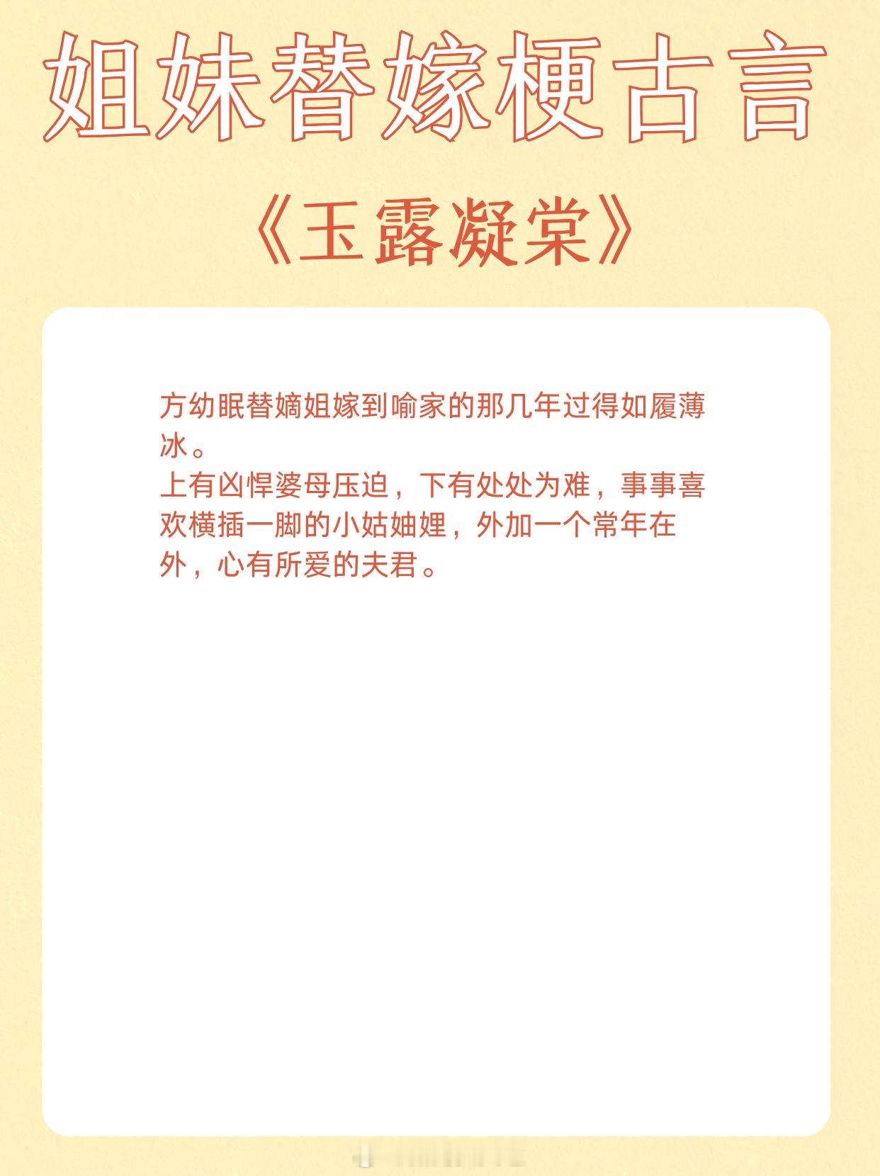 姐妹替嫁梗古言,青丝到白发,独占君心不悔。1、《替嫁多年后》作者:宁夙2、《和嫡姐换亲以后》作者:沉云香3、《玉露凝棠》作者:一枝嫩柳4、《换嫁春风》作者:明春鸢5、《替姐姐嫁给反派后》作者:二恰6、《折腰》作者:蓬莱客7、《替嫁宠妃》作者:归去闲人8、《替嫁美人(重生)》作者:柚一只梨9、《宠上眉梢》作者:乔燕这小说写在我心趴上了 这小说硬控我十分钟