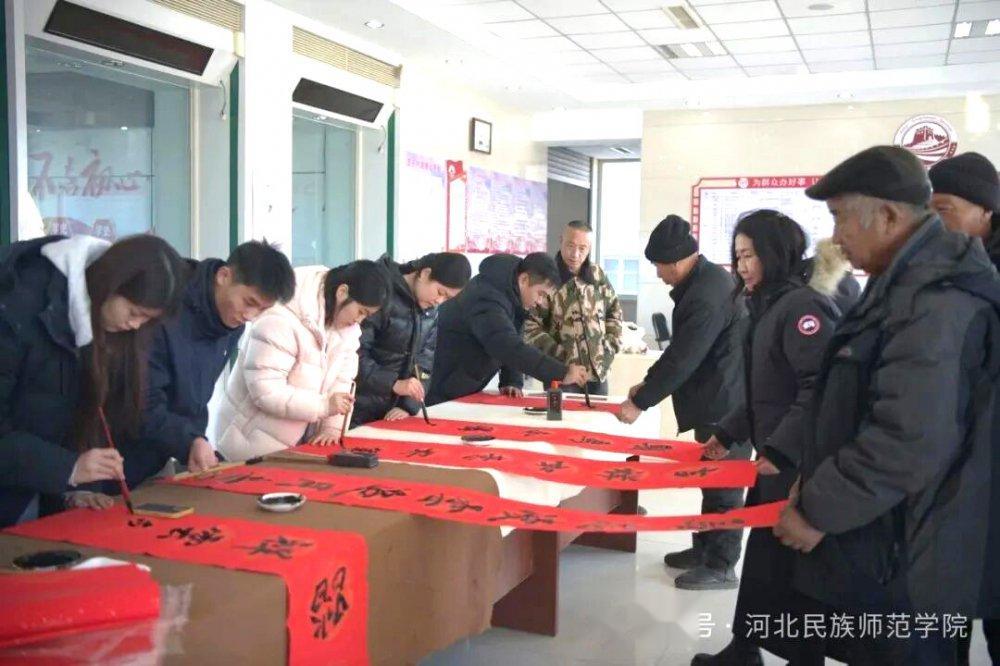 和合承德网讯(高晓东)马蹄踏雪千门瑞,春联送福暖乡村。1月22日,河北民族师范学院组织美术与设计学院师生代表,前往承德县下板城镇李家沟村、仓子乡七家村以及平泉市青河镇营子村,看望学校驻村工作队,并开展“送春联、传文化、暖民心”志愿服务活动,为村民现场书写并赠送春联和“福”字,送上农历马年的新春祝福。