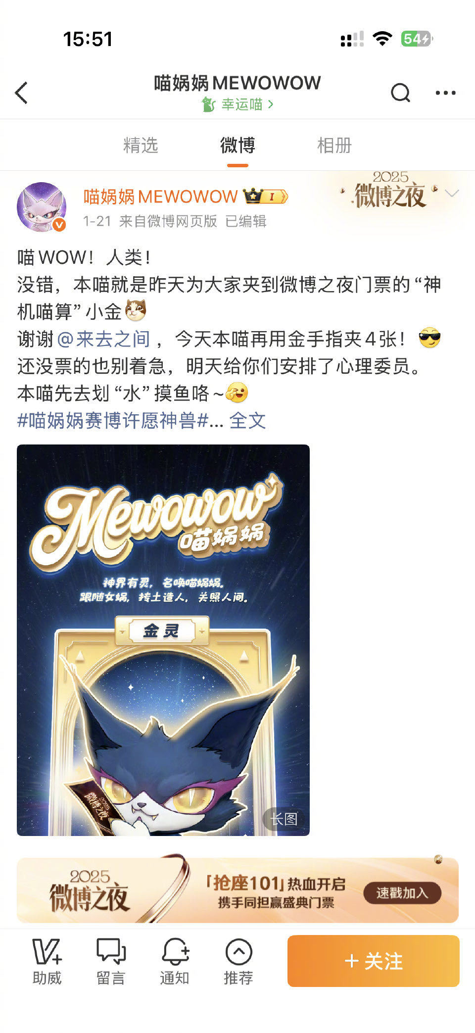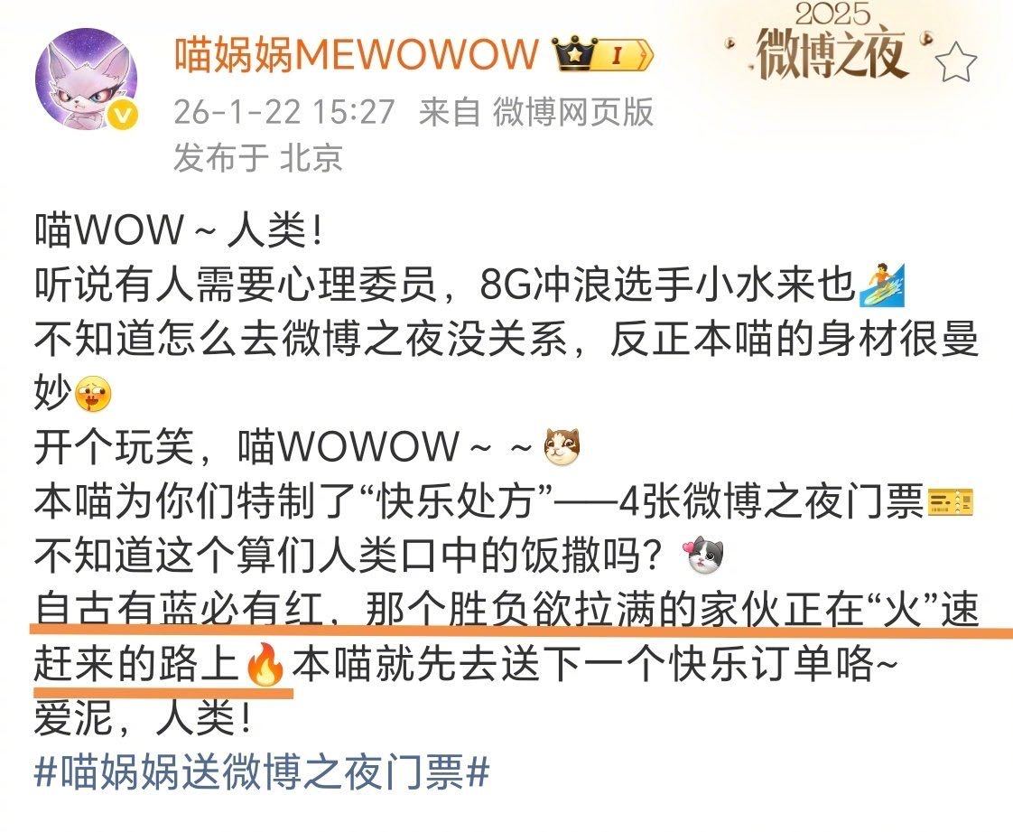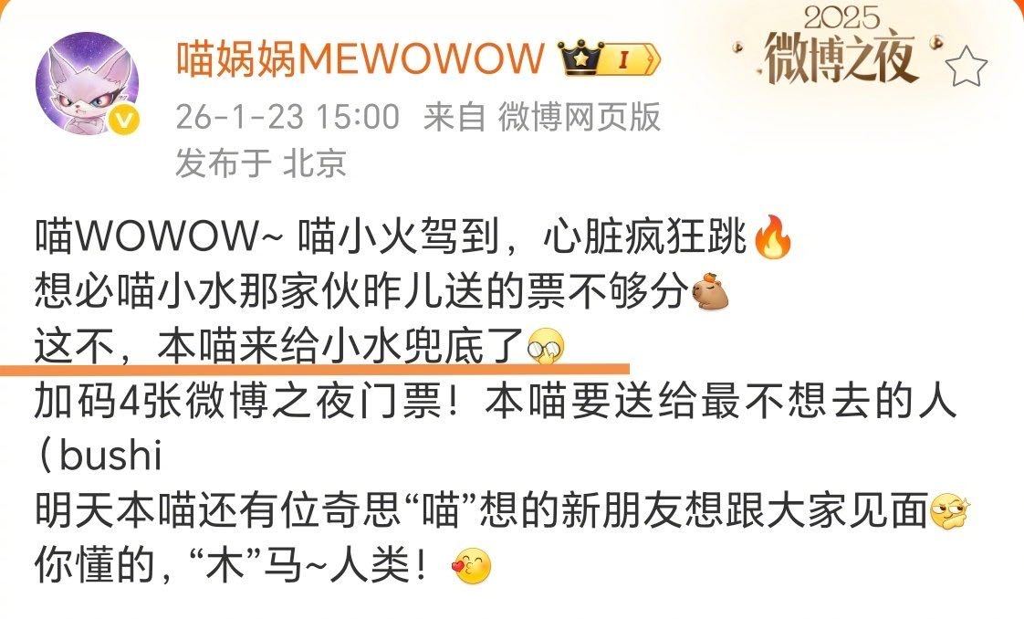 喵娲娲连送五天微博之夜门票 赛博许愿喵上线营业!连续五天狂送微博之夜门票,主打一个说到做到!还没领到票的宝子速冲TA最新动态,喊上诡秘一起蹲,圆梦盛典就现在!