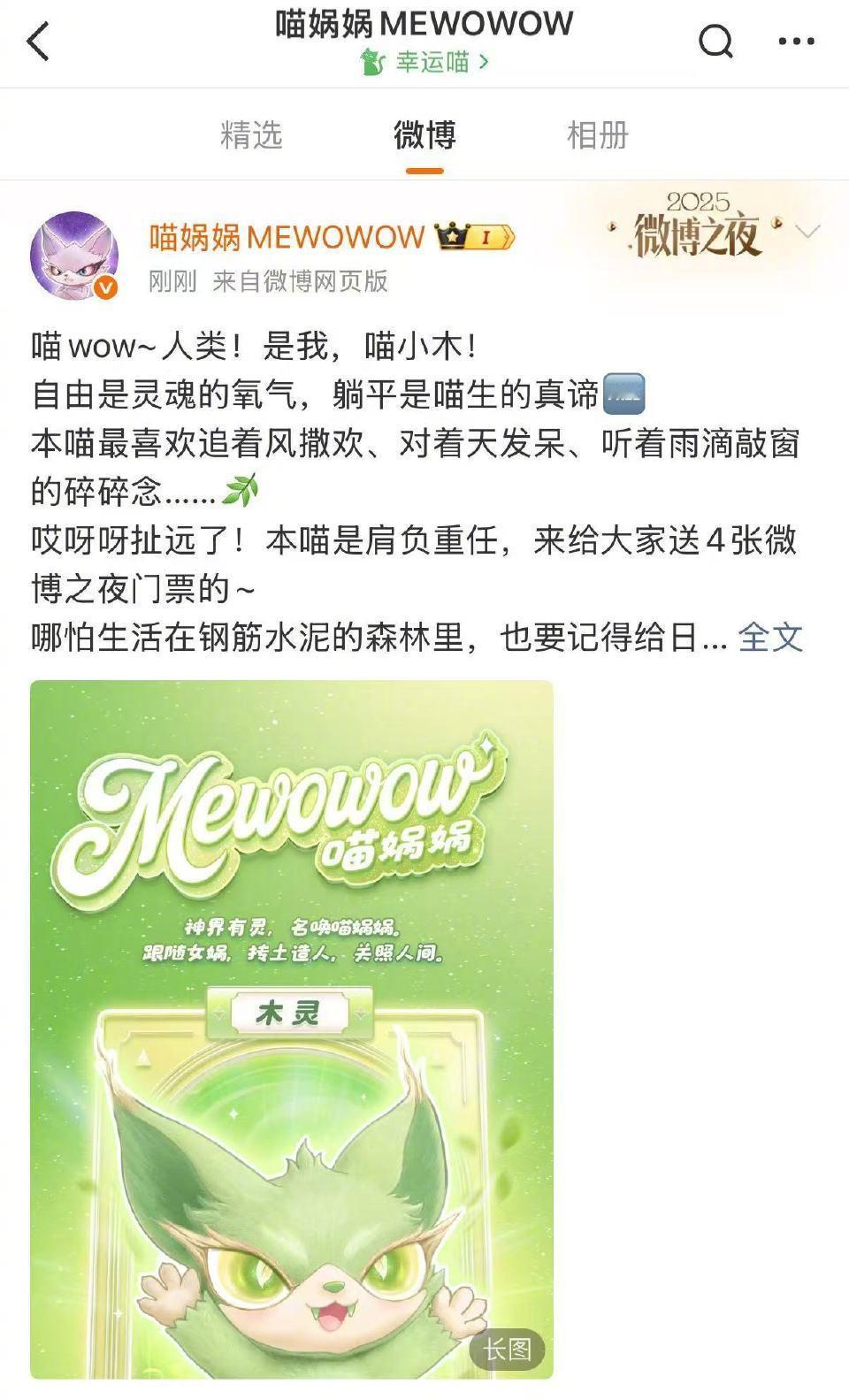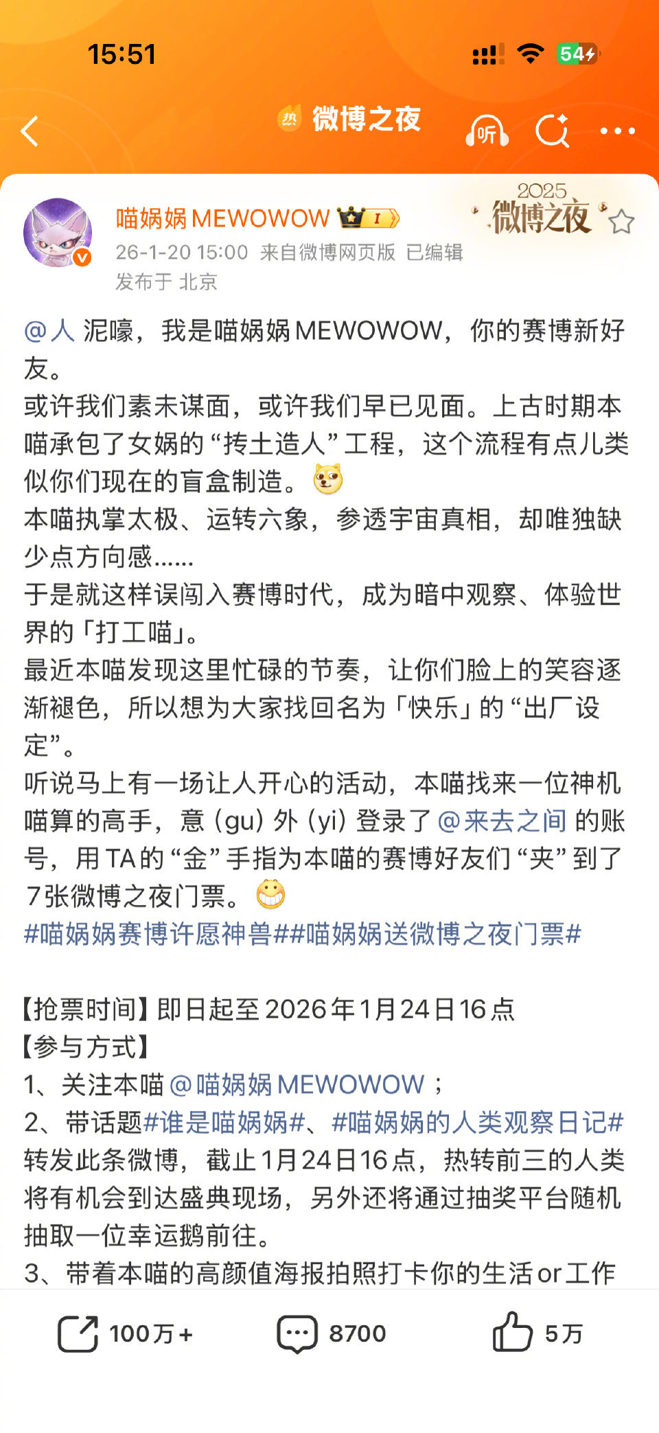 喵娲娲连送五天微博之夜门票 赛博许愿喵上线营业!连续五天狂送微博之夜门票,主打一