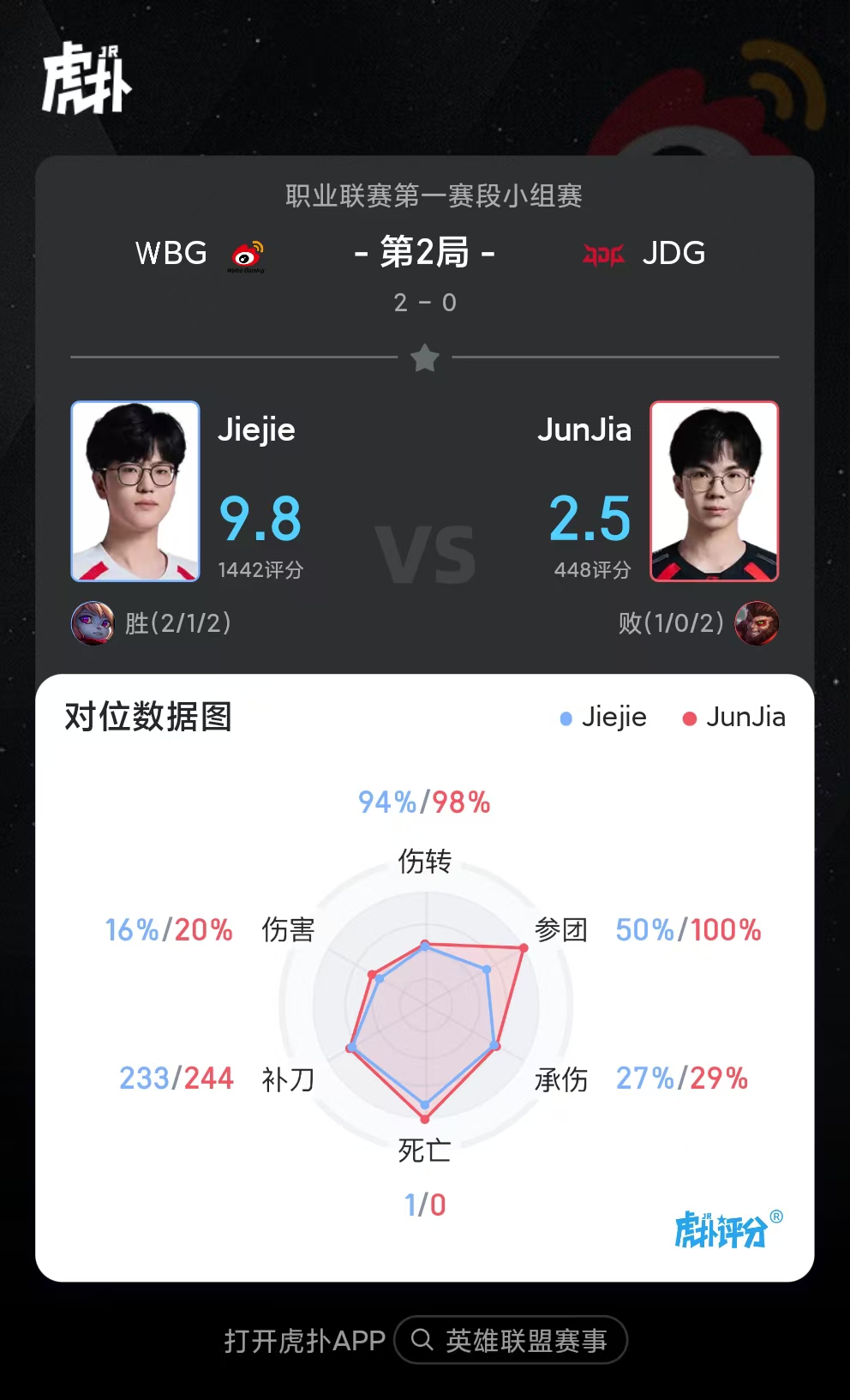 虎扑01月24日讯Jiejie波比打出2/1/2战绩,拿到WBG对阵JDG次局比赛MVP