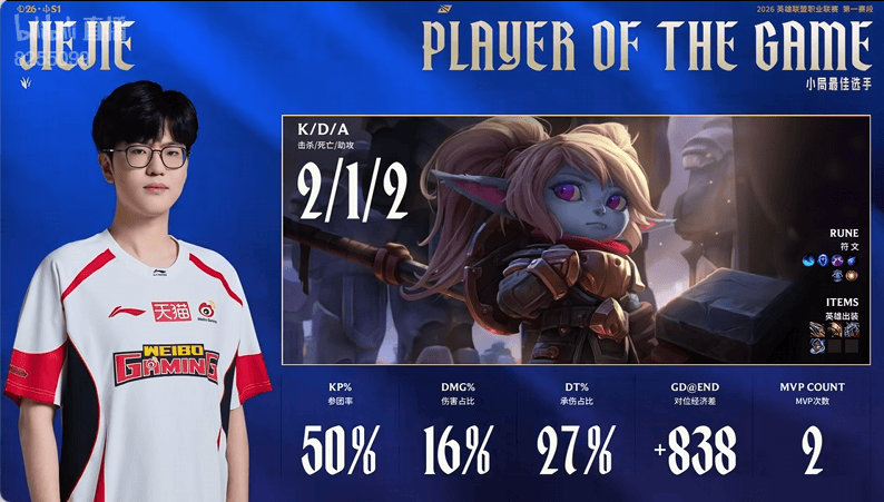 Jiejie波比打出2/1/2战绩,拿到WBG对阵JDG次局比赛MVP