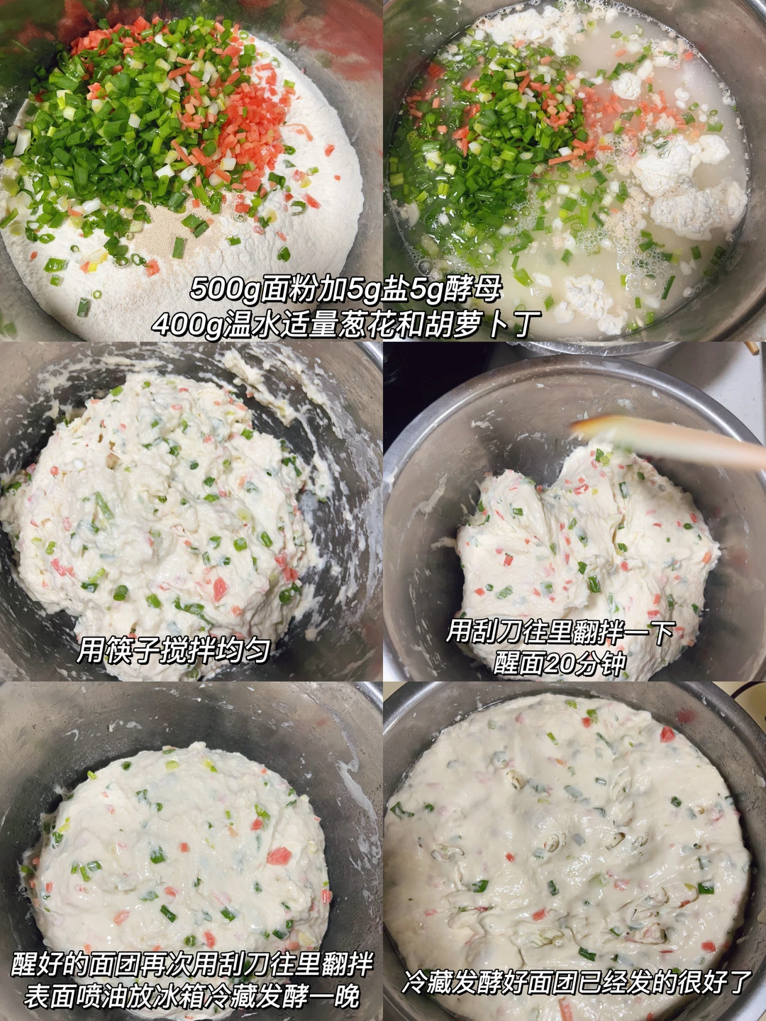 500g面粉、5g盐、5g酵母、400g温水、适量葱花和胡萝卜